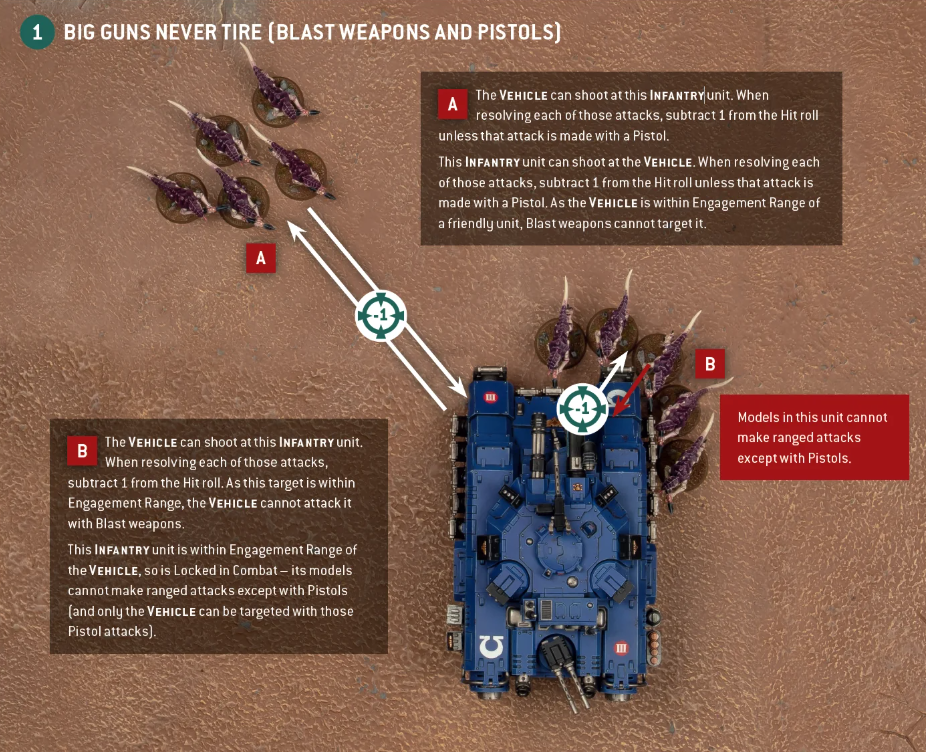 >>97900941https://wahapedia.ru/wh40k10ed/the-rules/core-rules/#Big-Guns-Never-TireHe was supposed to shoot the units he's engaged with only. Blast weapons are stopped unless it's like a solo vindicator or leman russ demolisher that has a rule that lets them.