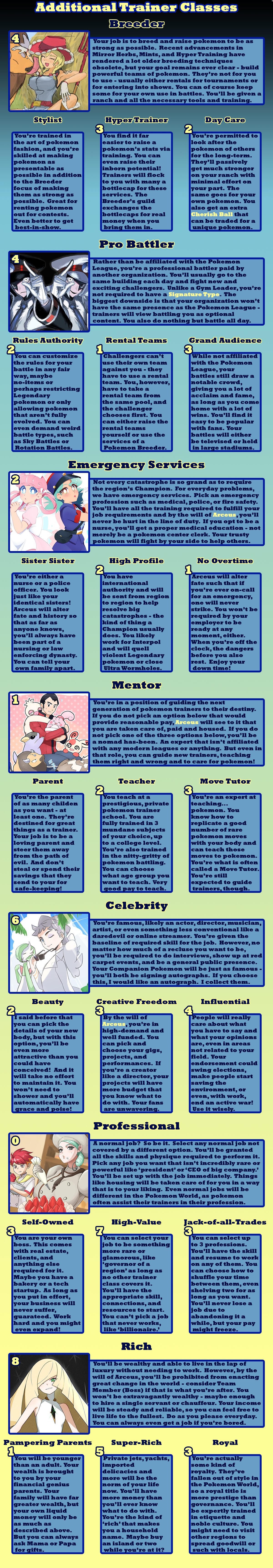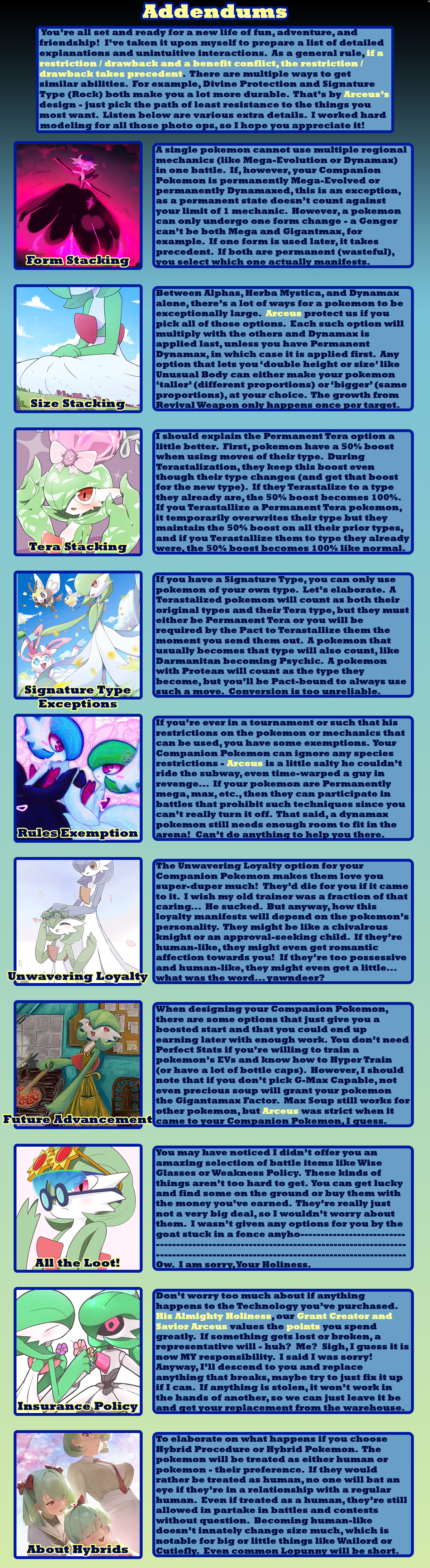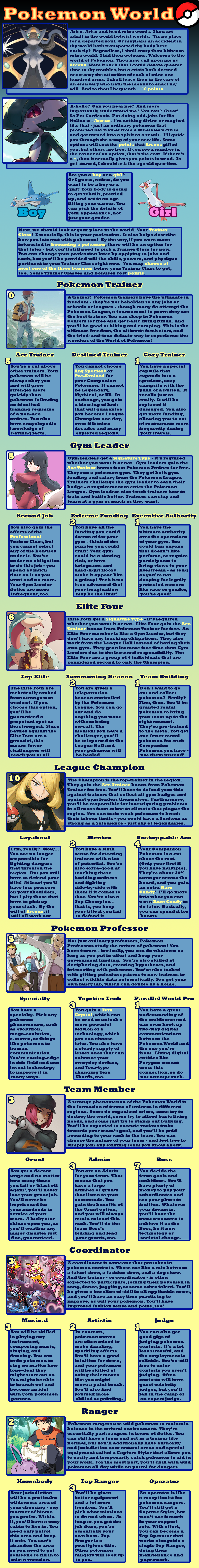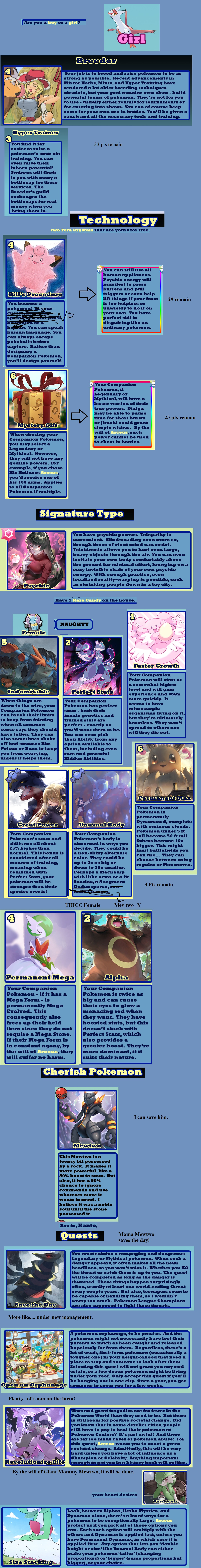 >>97900896>fancanonI tried to be very lore accurate, taking options from different official pokemon sources. Sure, there's the option for having your pokemon be sexy humans that I did for crowd-pleasing purposes, and some balance things to make signature types other than fighting, psychic, or ghost be worth taking, but a *lot* are options are rooted in canon. The immortality option is the plot of X/Y - down to making you unnaturally tall as a side-effect. Arceus canonically has given the player points that can be exchanged for prizes. A gardevoir spirit guide was a thing in Mystery Dungeon. Pokerus is the explanation of Faster Growth letting your stats raise quicker. The option to be turned into a pokemon is just what happened to Bill. I'll accept that some concessions were make to make balanced and appealing CYOA options, but I tried my best to be true to the lore - as much as I can with different sources being their own canon.>>97901019I tried to err on the side of caution since I'm typically too stingy with points. You do need to share them between Trainer Class, technology, and your Companion Pokemon, though. Not to mention it's 5 points for each pokemon after your first (unless you're fine filling out your team with wild ones). I team of 6 costs you 25 points right off.>>97901024Arceus is said to have 100 arms. Looking at Arceus, there's clearly not 100 arms. Given that Arceus gives pieces of himself to trainers sometimes, I interpret "arm" to mean "corporeal body".