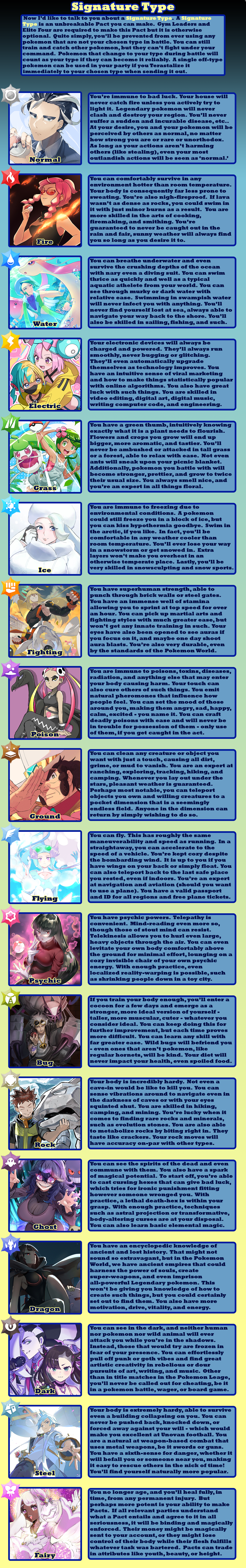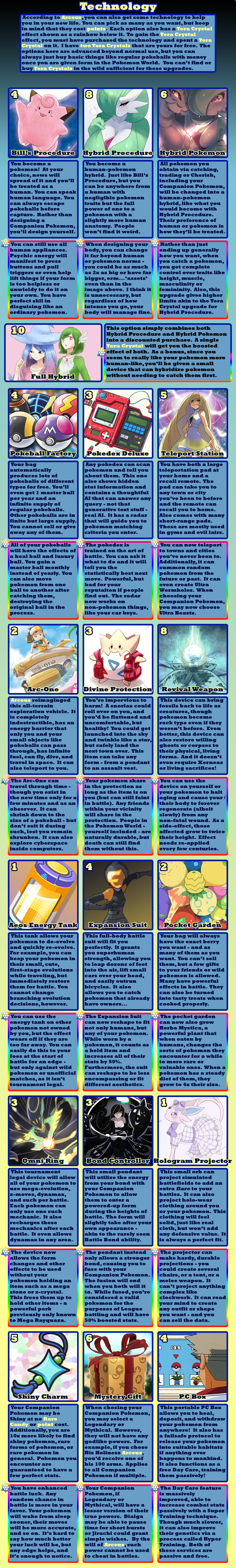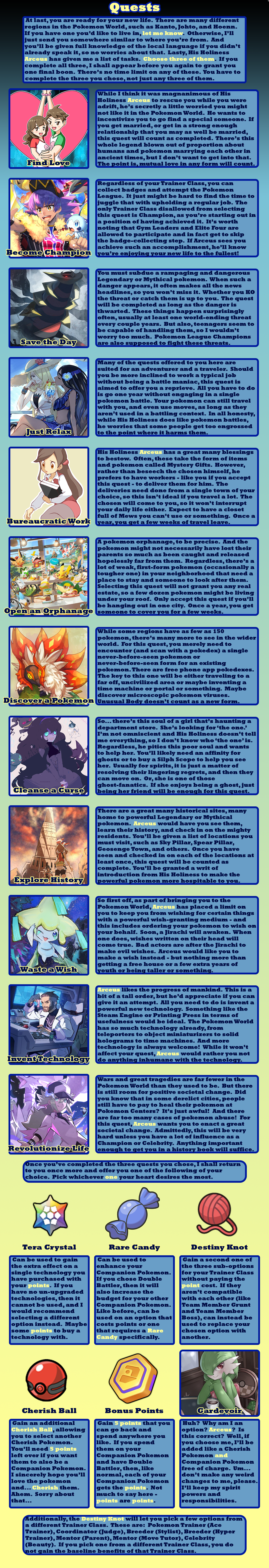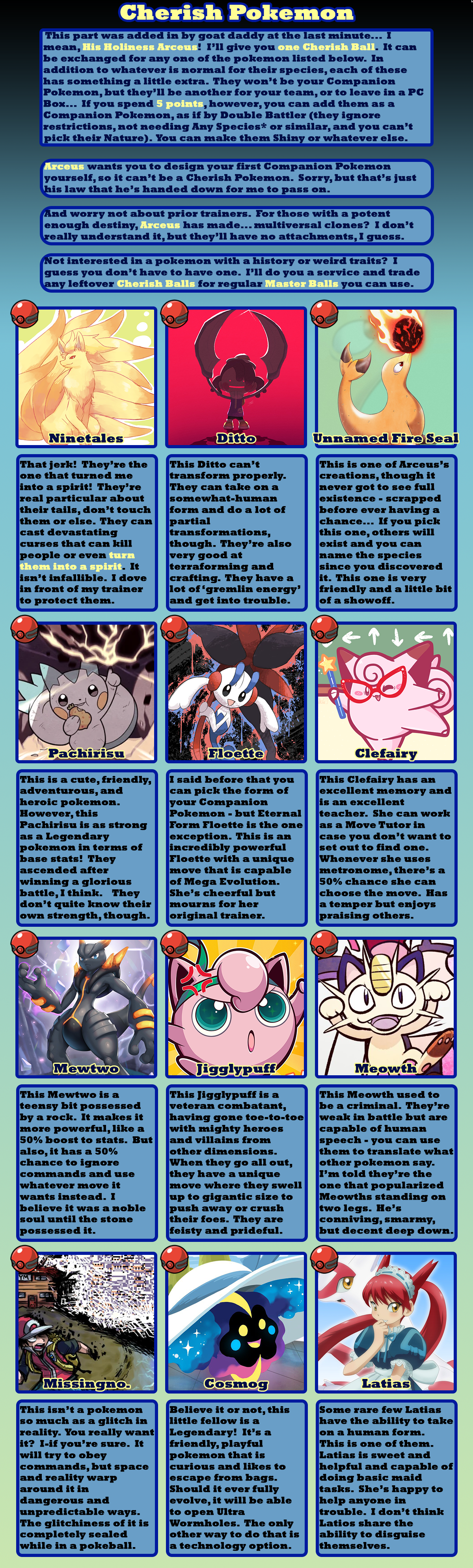 >>97900896>fancanonI tried to be very lore accurate, taking options from different official pokemon sources. Sure, there's the option for having your pokemon be sexy humans that I did for crowd-pleasing purposes, and some balance things to make signature types other than fighting, psychic, or ghost be worth taking, but a *lot* are options are rooted in canon. The immortality option is the plot of X/Y - down to making you unnaturally tall as a side-effect. Arceus canonically has given the player points that can be exchanged for prizes. A gardevoir spirit guide was a thing in Mystery Dungeon. Pokerus is the explanation of Faster Growth letting your stats raise quicker. The option to be turned into a pokemon is just what happened to Bill. I'll accept that some concessions were make to make balanced and appealing CYOA options, but I tried my best to be true to the lore - as much as I can with different sources being their own canon.>>97901019I tried to err on the side of caution since I'm typically too stingy with points. You do need to share them between Trainer Class, technology, and your Companion Pokemon, though. Not to mention it's 5 points for each pokemon after your first (unless you're fine filling out your team with wild ones). I team of 6 costs you 25 points right off.>>97901024Arceus is said to have 100 arms. Looking at Arceus, there's clearly not 100 arms. Given that Arceus gives pieces of himself to trainers sometimes, I interpret "arm" to mean "corporeal body".