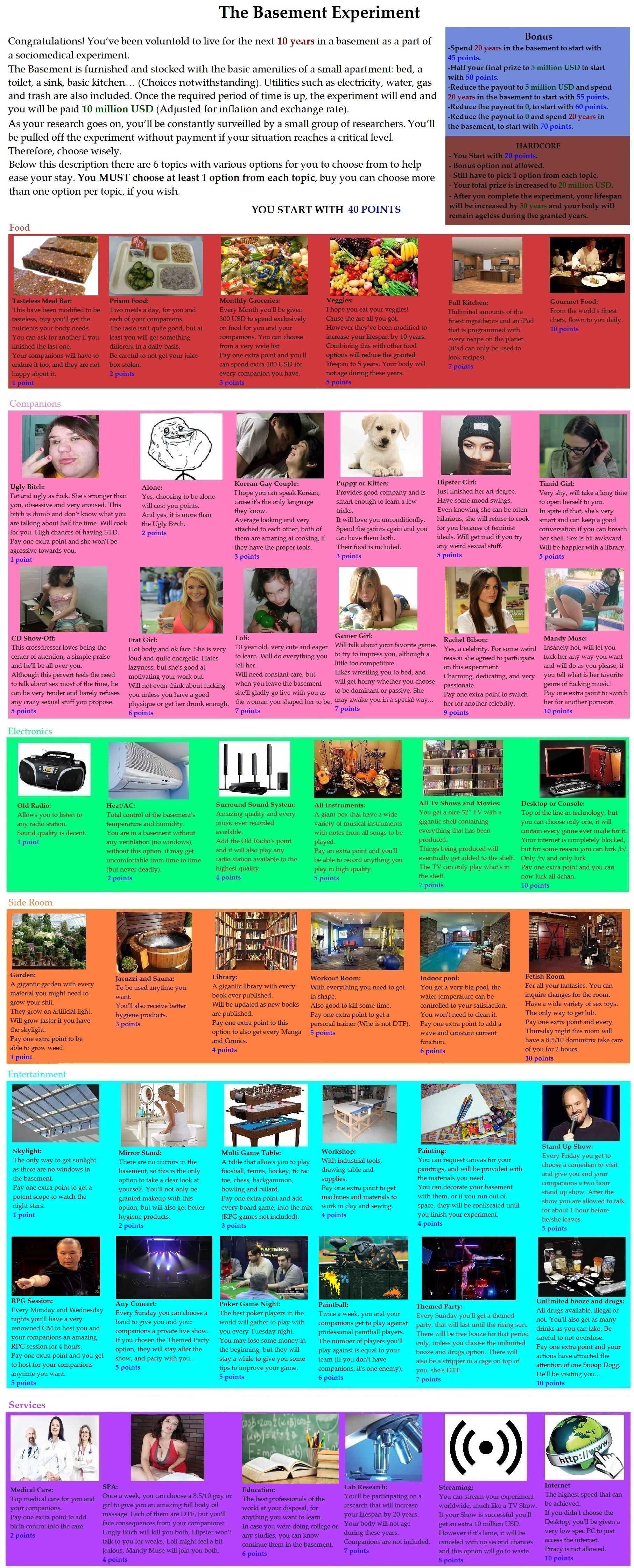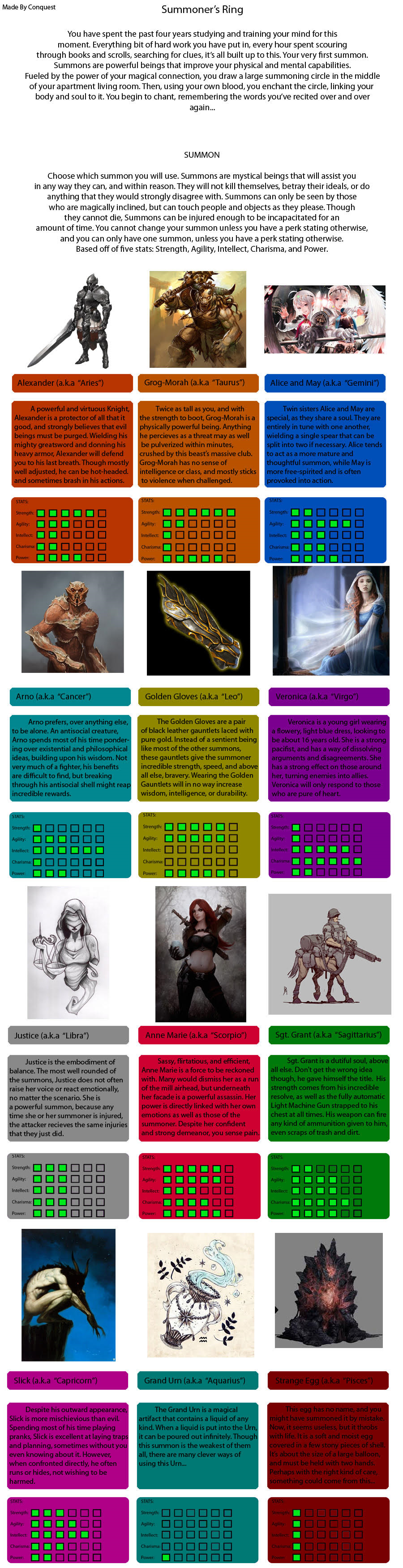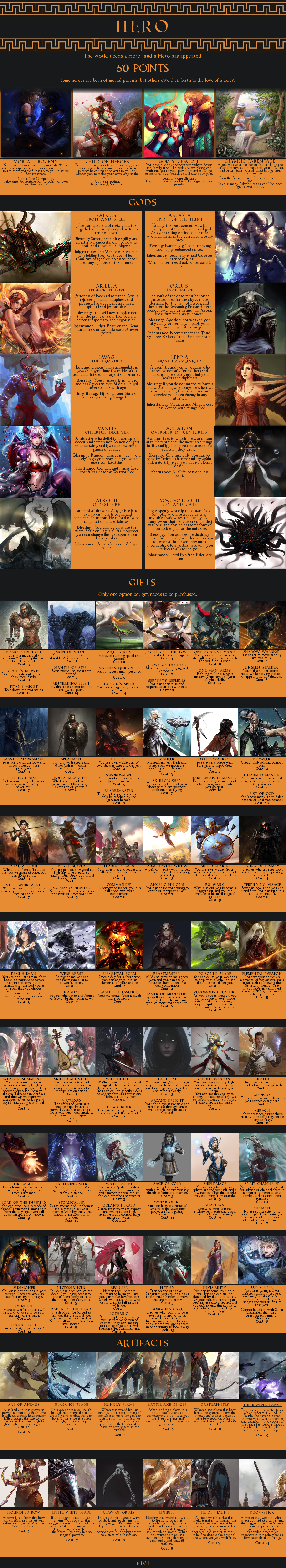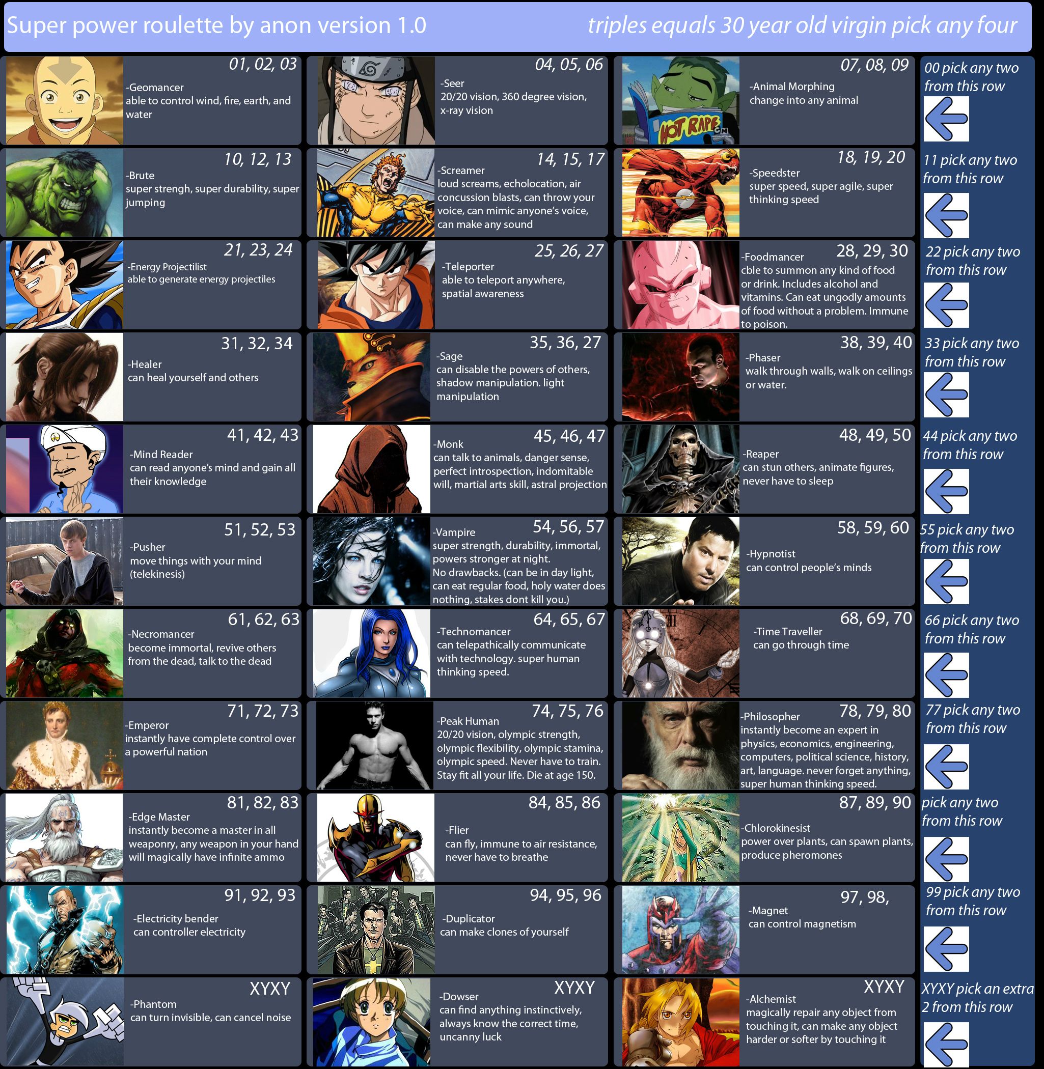 >>97900896>fancanonI tried to be very lore accurate, taking options from different official pokemon sources. Sure, there's the option for having your pokemon be sexy humans that I did for crowd-pleasing purposes, and some balance things to make signature types other than fighting, psychic, or ghost be worth taking, but a *lot* are options are rooted in canon. The immortality option is the plot of X/Y - down to making you unnaturally tall as a side-effect. Arceus canonically has given the player points that can be exchanged for prizes. A gardevoir spirit guide was a thing in Mystery Dungeon. Pokerus is the explanation of Faster Growth letting your stats raise quicker. The option to be turned into a pokemon is just what happened to Bill. I'll accept that some concessions were make to make balanced and appealing CYOA options, but I tried my best to be true to the lore - as much as I can with different sources being their own canon.>>97901019I tried to err on the side of caution since I'm typically too stingy with points. You do need to share them between Trainer Class, technology, and your Companion Pokemon, though. Not to mention it's 5 points for each pokemon after your first (unless you're fine filling out your team with wild ones). I team of 6 costs you 25 points right off.>>97901024Arceus is said to have 100 arms. Looking at Arceus, there's clearly not 100 arms. Given that Arceus gives pieces of himself to trainers sometimes, I interpret "arm" to mean "corporeal body".