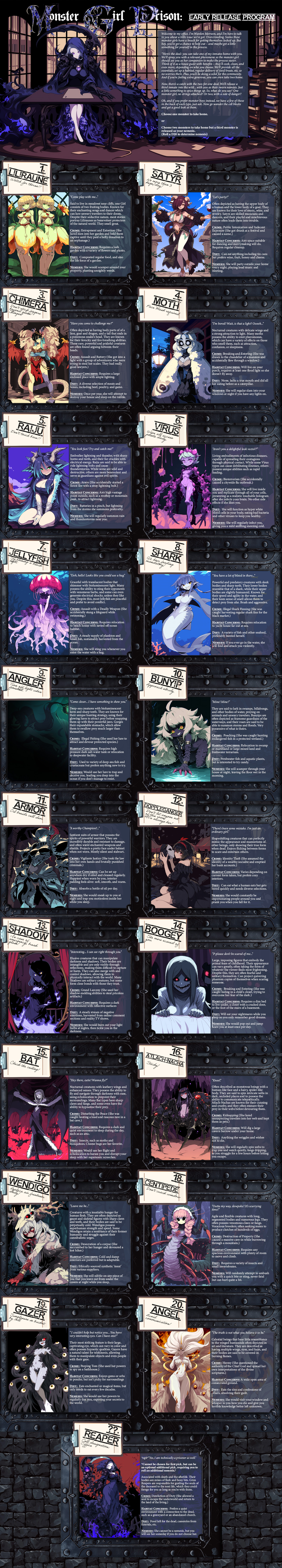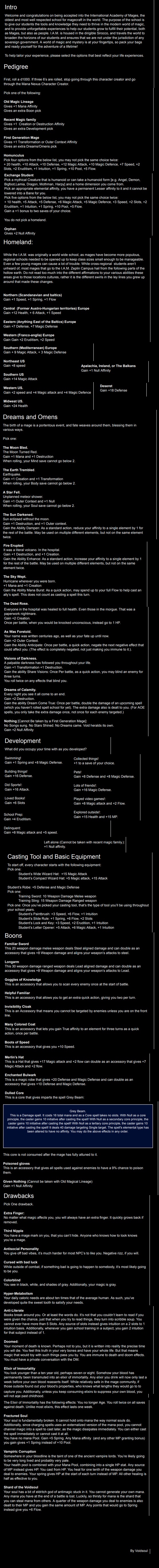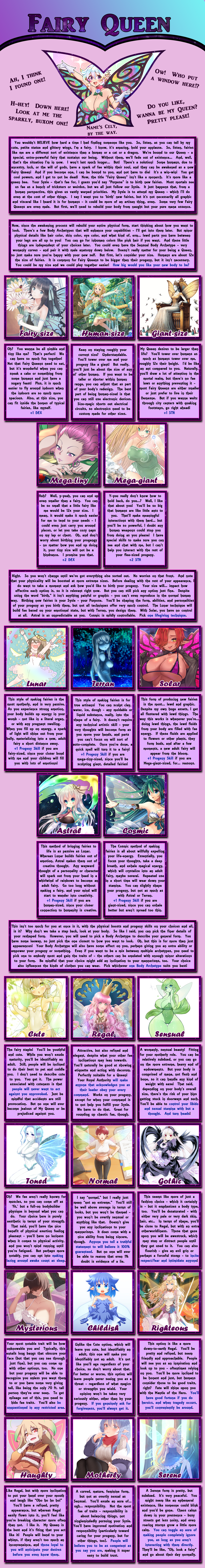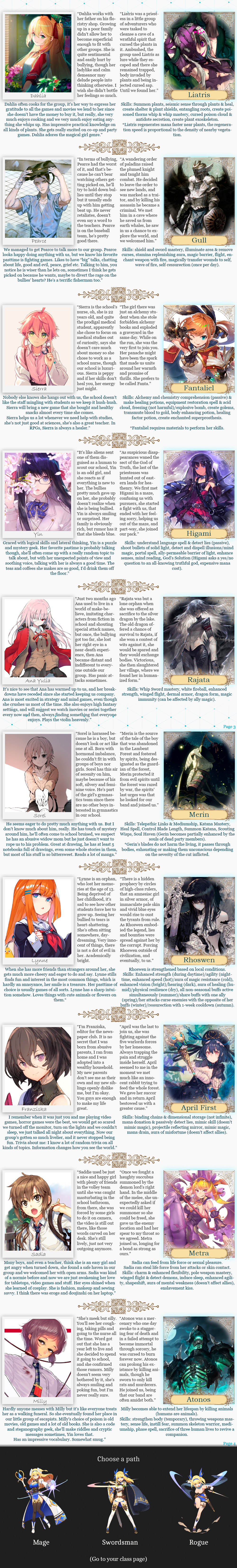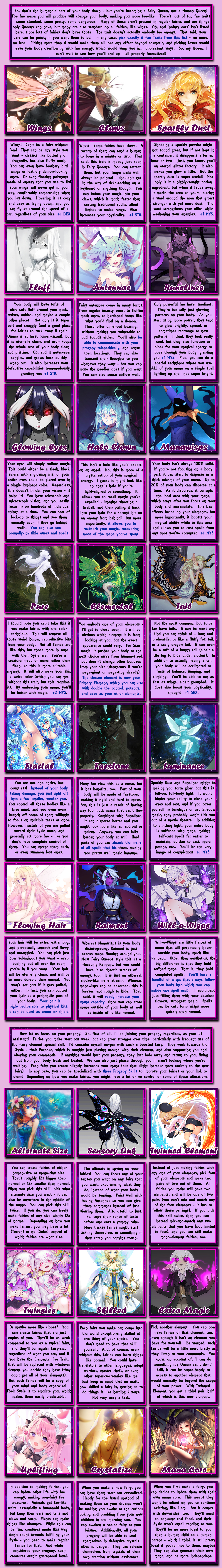 >>97901087Well, I did put in alternatives for that. See >>97901119 . Or if you become a pokemon and pick Unusual Body, you can be up to 20x smaller to offset the many things in the pokemon world that make you grow.>>97901157I wasn't sure what do for them other than say "here's this canon character and what their personality is. do you want to be their friend?" If there's demand for it, I could add a page for something like that, though.>>97901158Fair, I did design it with a lot of pokemon background knowledge required - namely in that it assumes you can pick a favorite out of the pool of over 1000 pokemon. And yes, the hologram projector can work outside of battle. You could even make your own Jacinthe zones - not that that would mean anything to you.>>97901138Mismagius is a fun pokemon - one of my favorites. I like your classic journey to become champion. I feel like having an impish ghost type that refuses to go in their pokeball is sure to get someone into trouble, so that sounds fun.