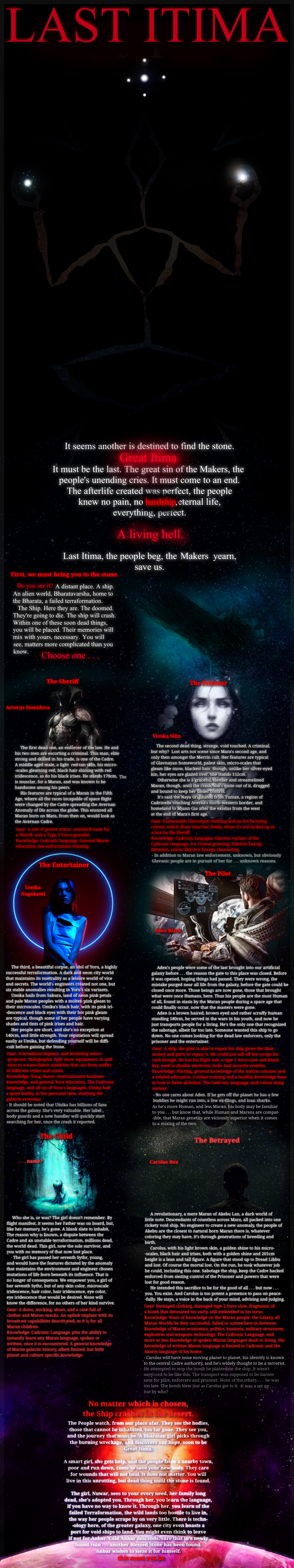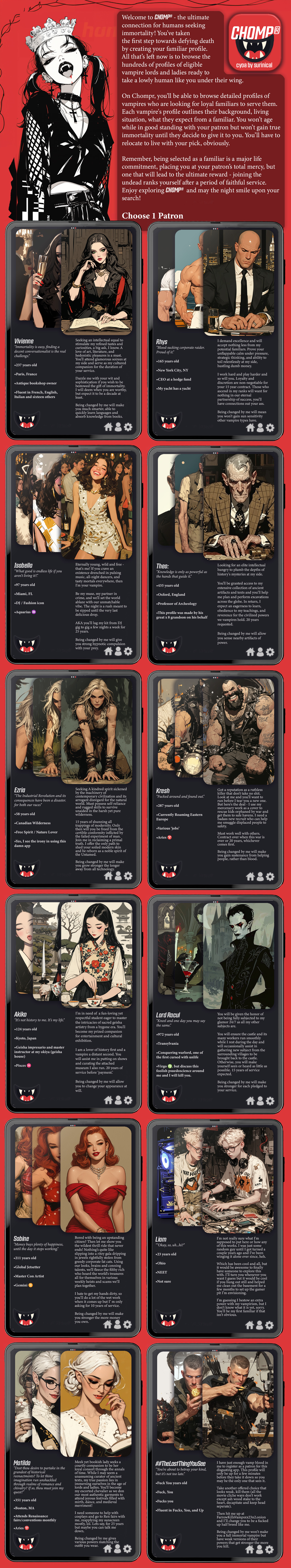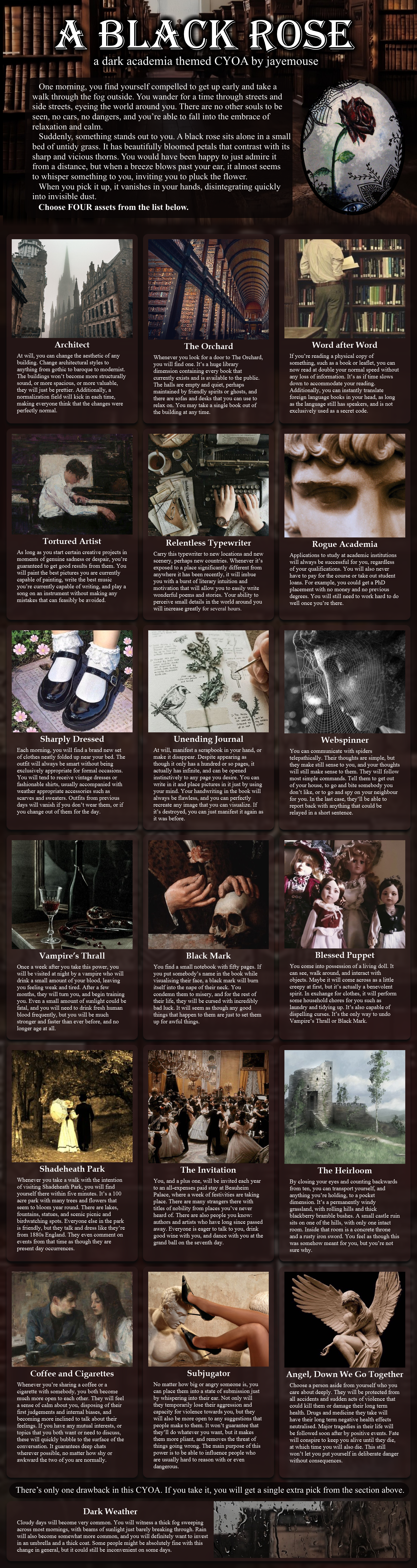 >>97900959Depends on my level of enjoyment of the cyoa itself. Some are a straightforward list, others are basically elaborate proto-novels that I'm still adding to till this day.