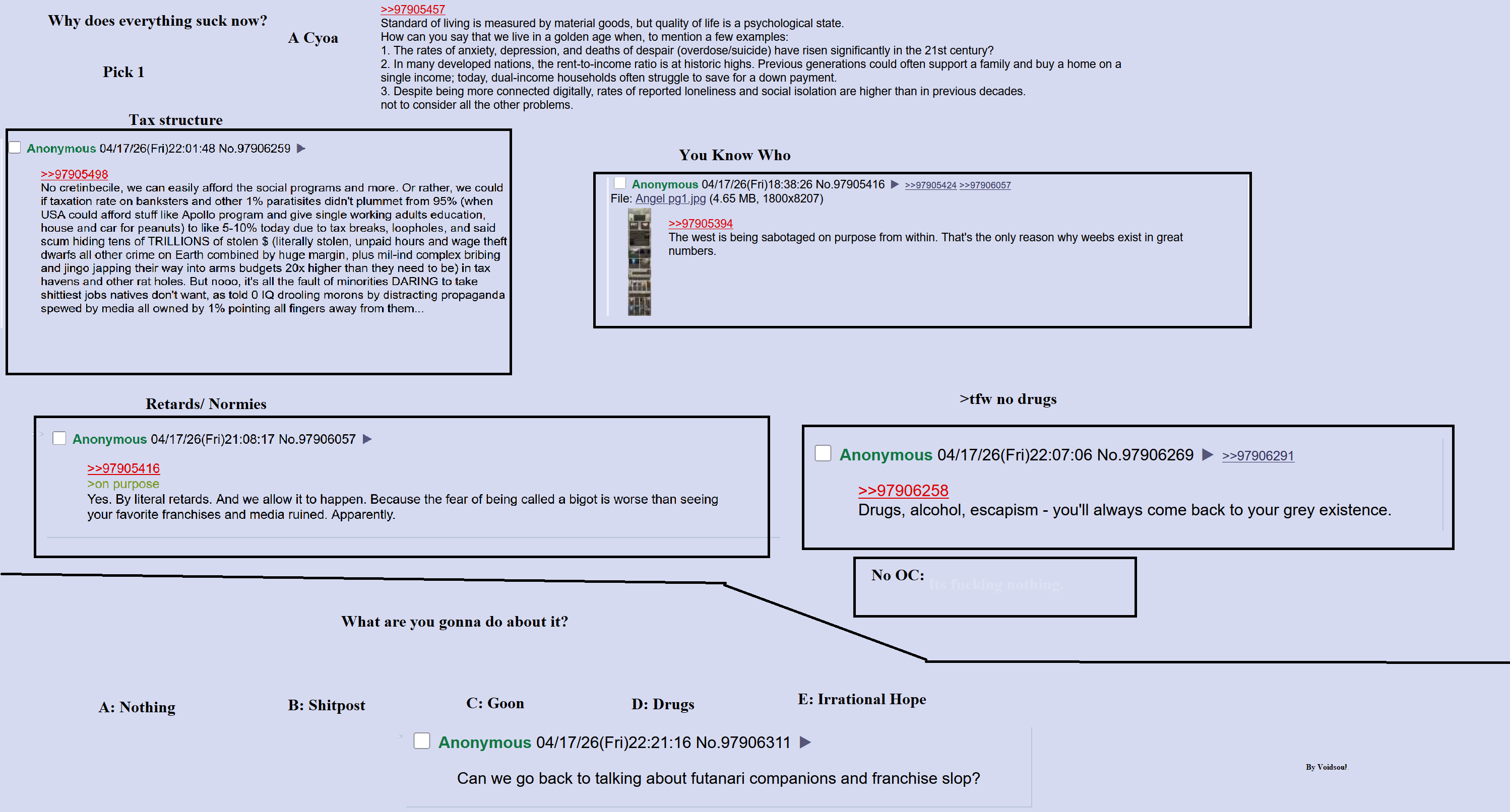 >>97906322>Tax Structure>Nothingin reality its a combination of all of these, I guess. Same with what I'm going to do about it. I wish we had more CYOAs that used the 4chan look, or even real posts like this. I think it would be cool if there were some that were like an ARG played out through various boards and threads. it could be done!>>97906383Thanks for putting on the poll, even if the outcome was obvious. hopefully next month has more to work with. I'm glad I wasn't the only one to vote for CoDN. Obviously I recognize that LotM is better made in a bunch of ways, but it doesn't have the personal impact that its opponent did. I would rather play a CYOA that asks us a clear, concise question about ourselves and our wants than one where we argue about the minutiae of option combinations that say relatively little about the player or character