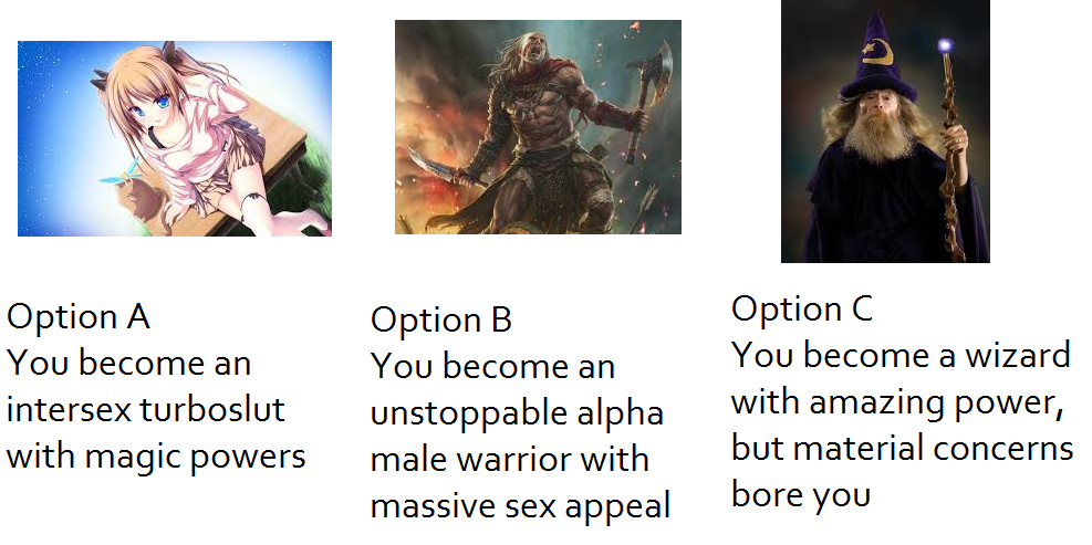 >>97901185 (cont.)>>97897941Dug a 25m hole. 72% chance to die.Despite Anon's death wish, he survived and won even bigger. He got $111,111,111,111,100 worth of gems, 2 sages, 5 artifacts out if it. Anon was generous and donated the top gem to scientists, to harness whatever makes it so valuable. This is the sci-fi utopia timeline. The surviving anons better hope they live in the same timeline.>>97898323Dug a 25m hole. 72% chance to die.Two demons got him. Which of them should get to murder Anon, they argued. Neither would be satisfied with sharing his murders. Did the demons tear each other apart in the heat of the argument? Was Anon be let off scot-free? No, they used demonic magic to split Anon into two Anons, and each demon murdered one Anon. There are now two Anons walking around, seemingly, but both are demons wearing his skin.-----------------------In summary, anons are:1. Fearless gamblers2. LuckyThat said, the probabilities didn't work out the way I would've liked: I'd have liked it if the first meters have astronomically low risk, and the later meters approach P=1 faster, because then the player would be more motivated to think hard about how much to bet; but as it is, it even seems sound to risk it all. So I structured it poorly.