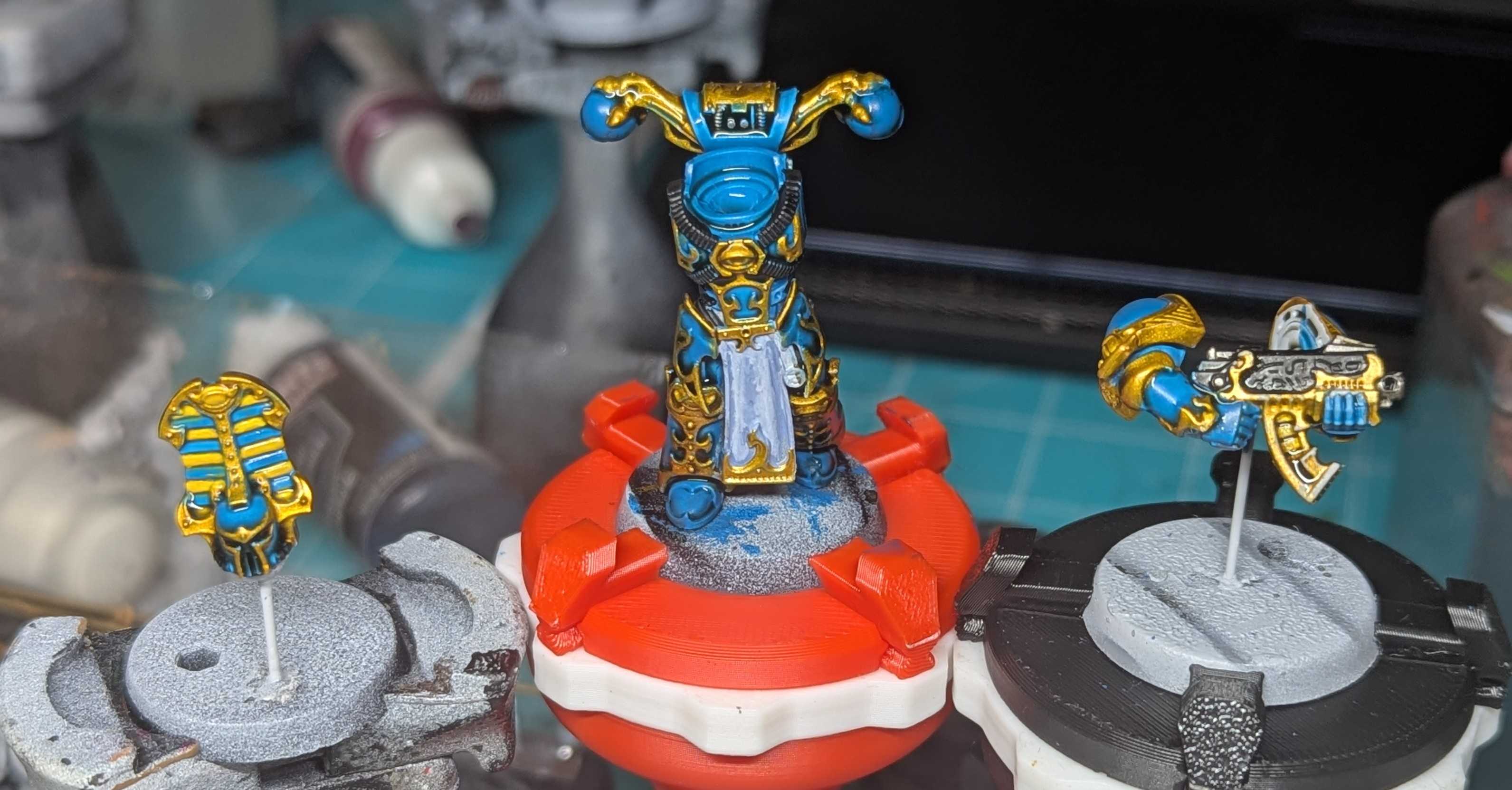 >>97910955Anon, On your next models try priming with like a matte red before doing the yellow, then paint the green bits independently (yellow or grey primer) before glueing them onto the minis.That'd help your yellow consistentcy a lot, which would then make your maroon details and everything else work a lot better.Use smaller brush strokes I guess?
