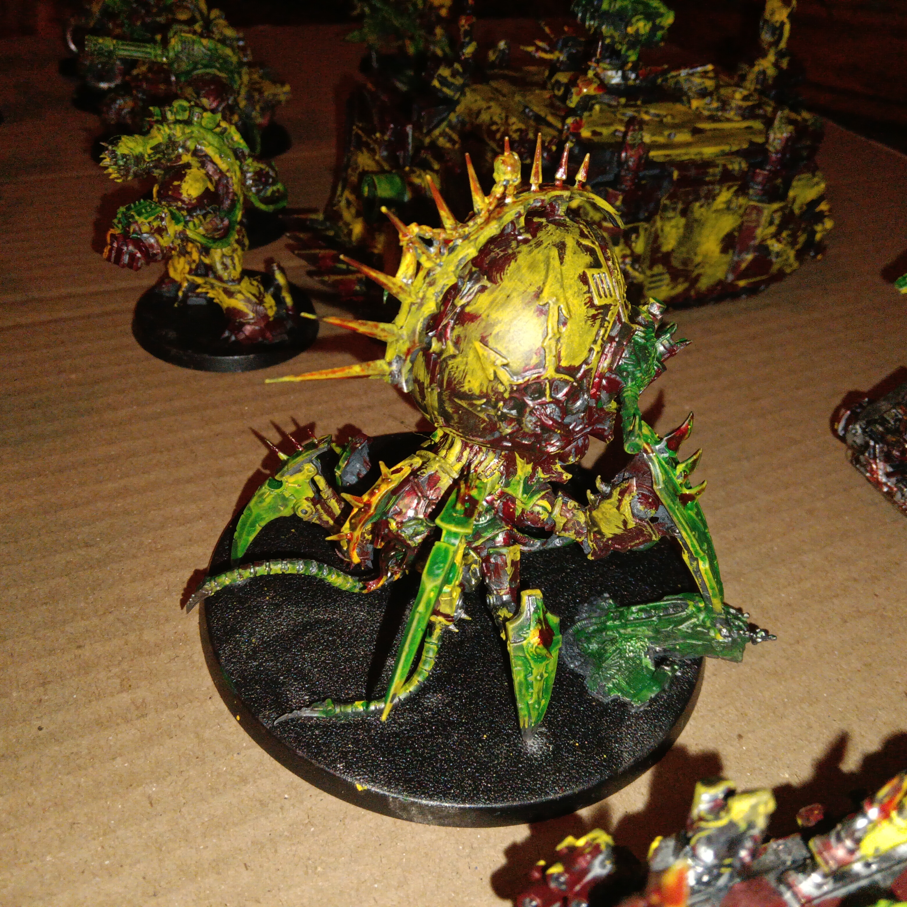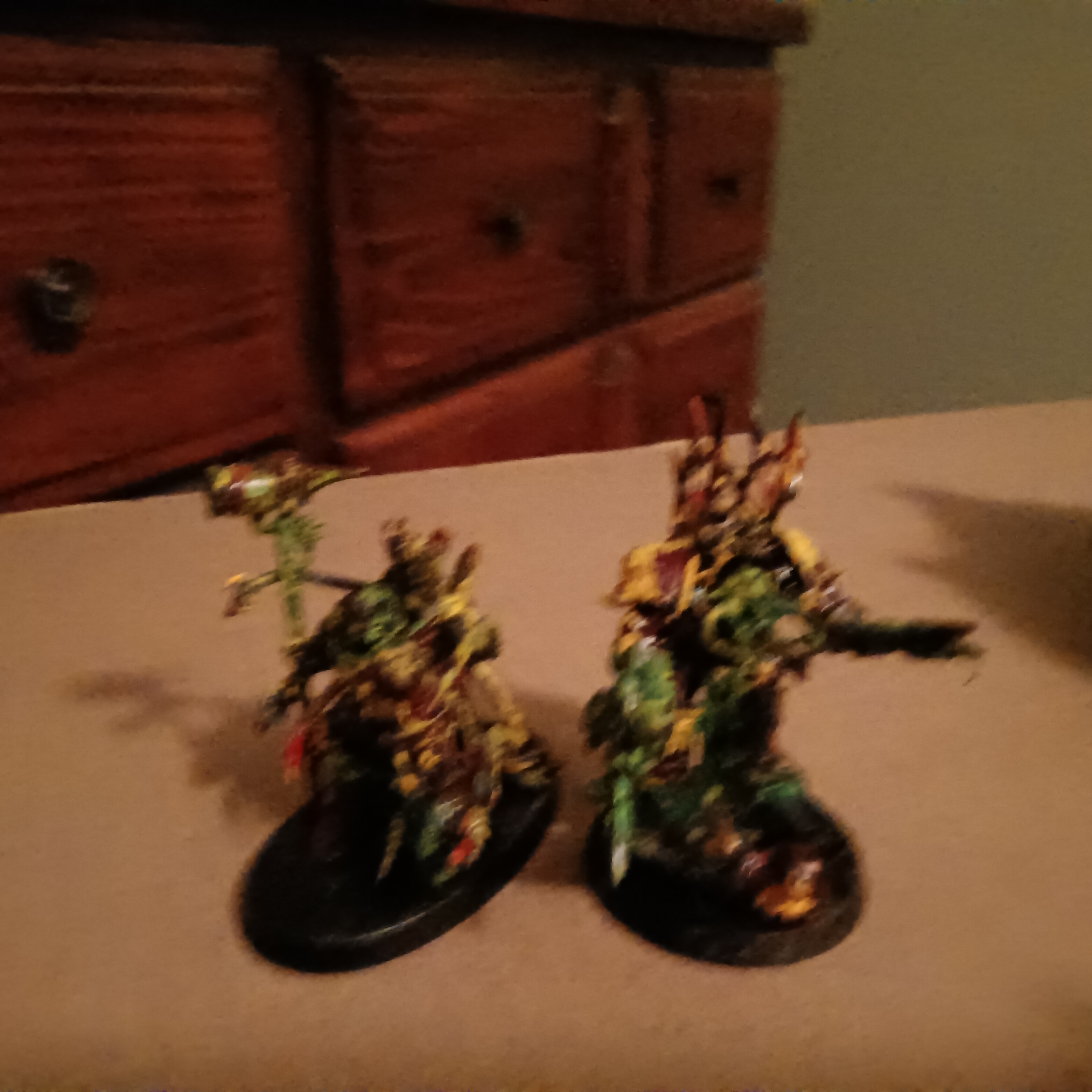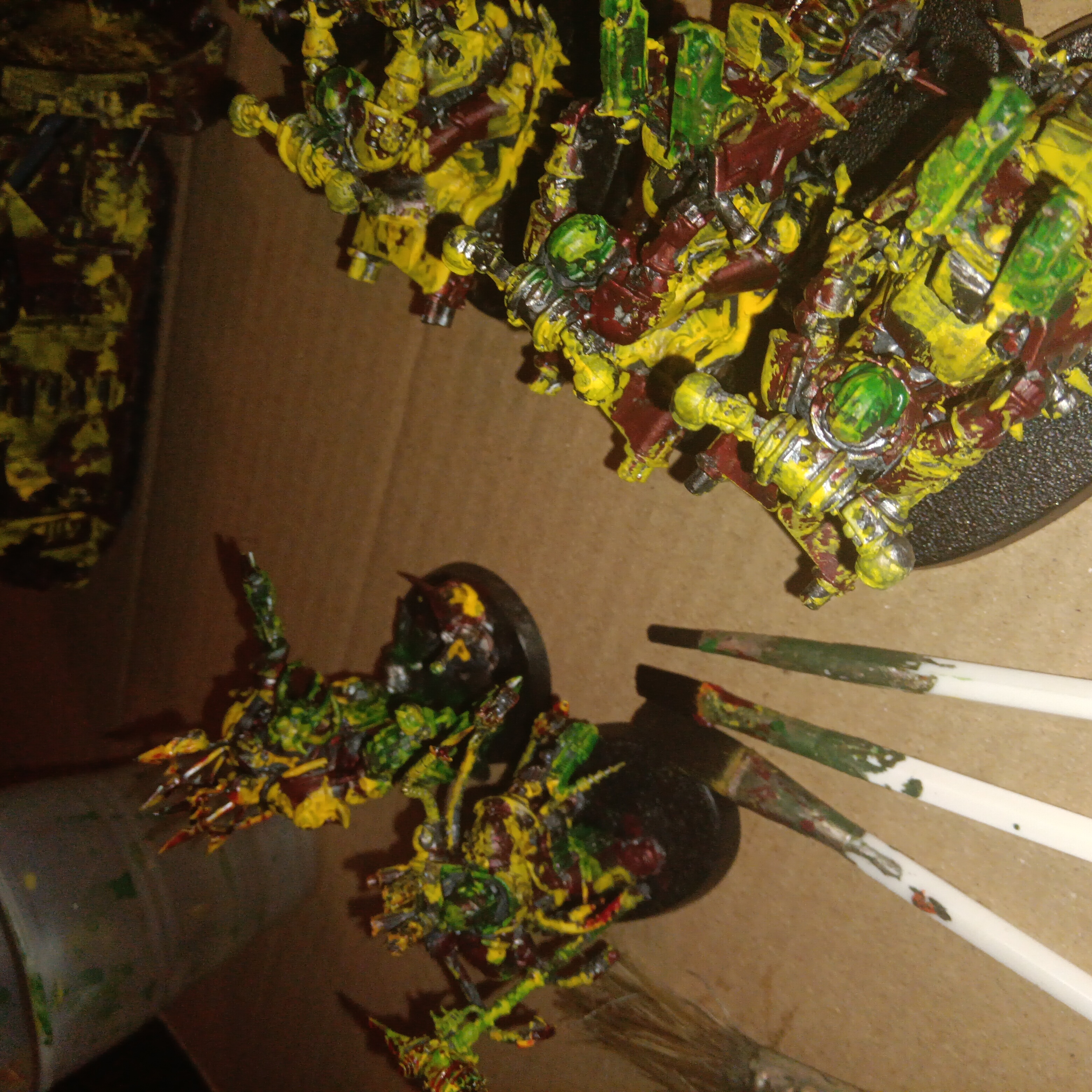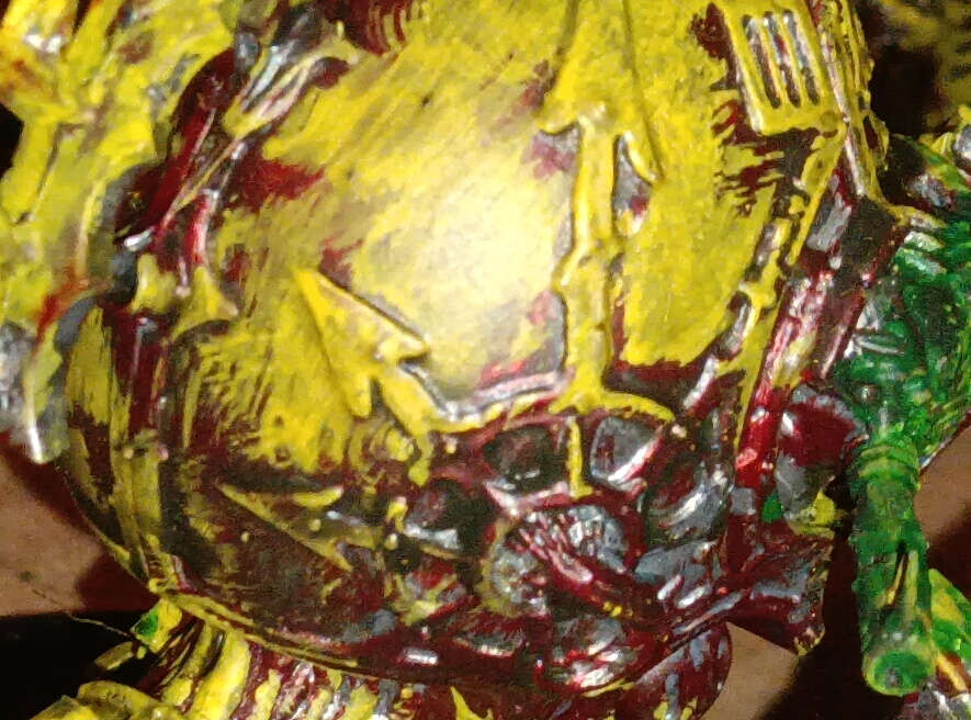 >>97910955I recommend maybe painting the default color scheme before trying your own. It's important to learn the fundamentals and the rules before you can break and bend them to fit your vision. That said, I'm not sure what your vision is. I can tell you want your minis to look savage and bloody but the yellow and green I'm not quite sure you're trying to achieve.