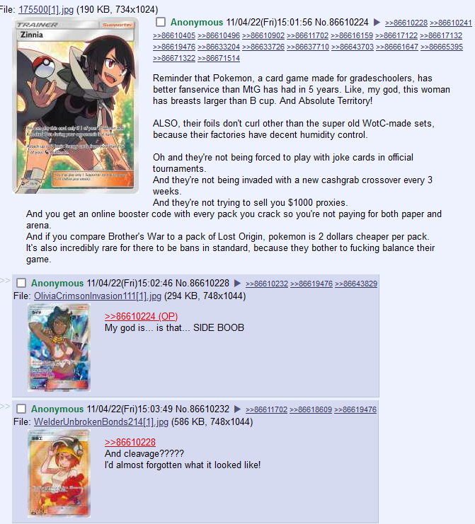 >>97915954>Its not due to lack of pretty women.There are plenty of shit things that have big fandoms due to pretty women. Sex sells is a fact as old as time. You are a retard.>Its from the fact that since MoM they are just moving at a schizophrenic rate instead of actually let any plane and things happening on it actually breathe.And players bitched about the 3 block systems with the one metric Hasbro cares about: their wallets. Sales for the 2nd and 3rd sets of blocks always plummeted. Players today bitch about most UW sets. The playerbase clearly doesn't care as much about the story as they claim to. You are retarded.>People like what was going on with the Phyrexian invasion and all of phyrexia were literally monsters.You have zero proof of that besides your anecdotal evidence. You are retarded.>If all of the characters were 11/10 knock out women, people still wouldn't care.Reality proves you wrong. You are retarded.>Most of the people playing Tifa from the FF set likely never played 7 at all. They don't care about that story, just a pretty girl.Wrong. You are retarded.>So you entire argument is retarded.Okay retard.