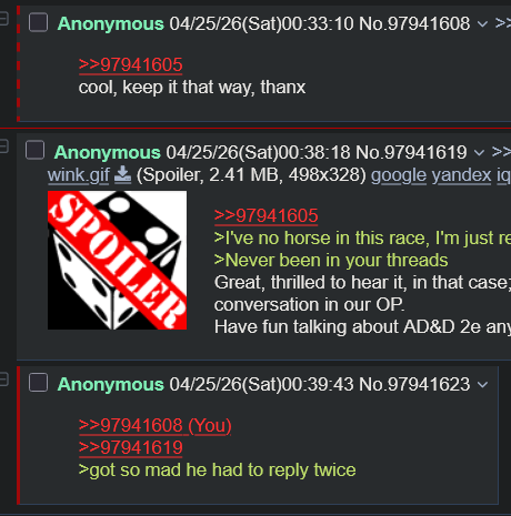 >>97941749>wow, great post there.Agreed, that's why I saved it.The only people who bitch about something having a boundary are those who want to violate it. Shit there's plenty of games I like but don't talk about in /osrg/ because they're not relevant to the topic at hand.I remember at one point our local autist attempted to force a merger on /pfg/ and /3.5g/ because "Well they're basically the same system mechanically so it should be one thread"No one was a fan of it, to put it mildly.He actively ignores any attempt to explain why 2e is off topic to him and has outright murdered /2eg/ with hours of shitposting because people actually being able to talk about the game in its own thread removes his ability to shit up /osrg/Sounds insane right?https://archive.4plebs.org/tg/search/subject/%2F2eg%2F/Pick any thread after the 02/11/2025 one and go see for yourself.