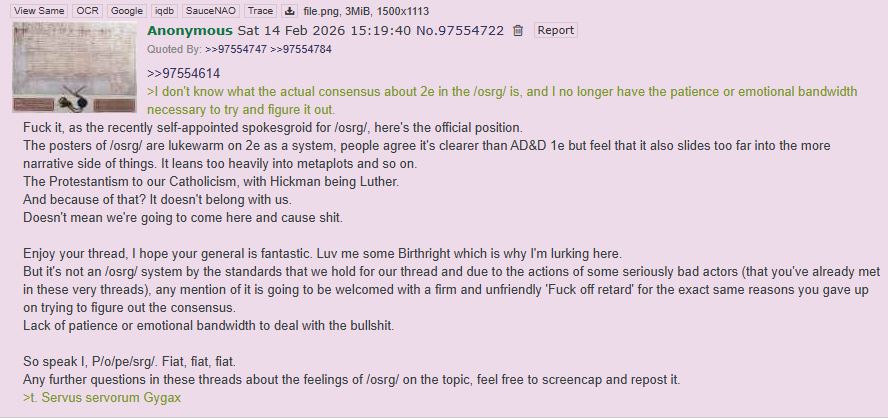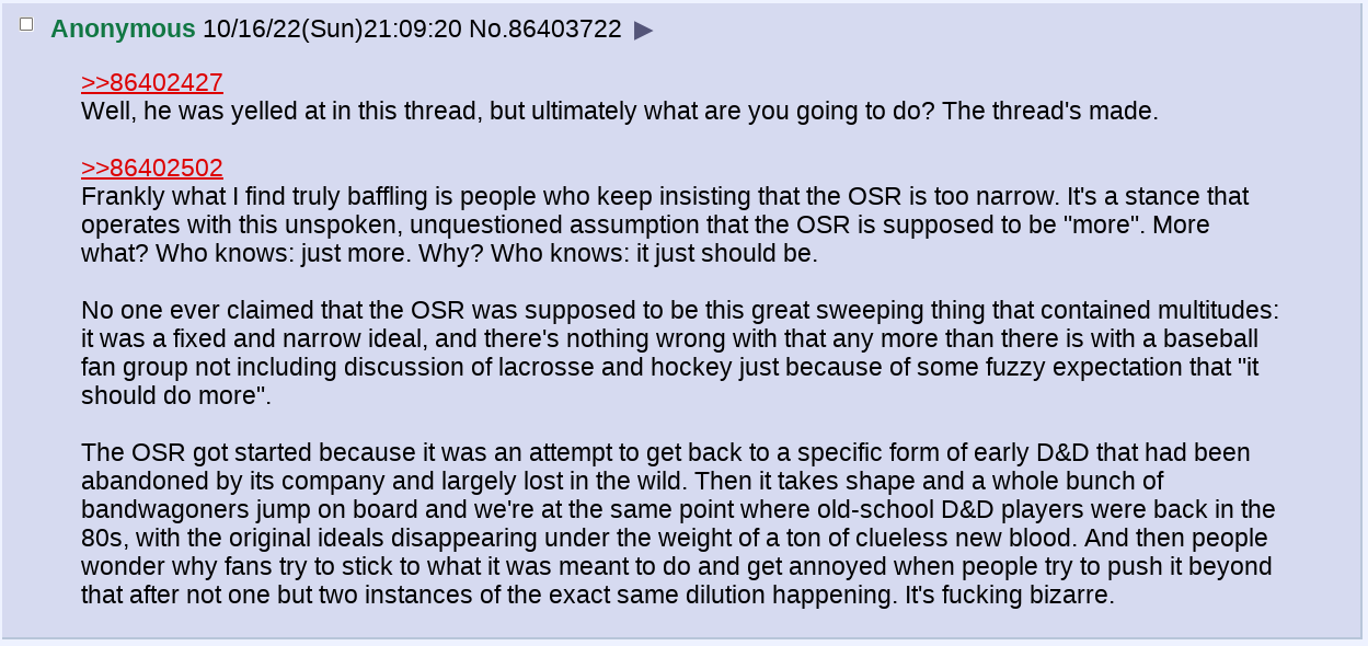 >>97941722>But it's not off topicit is for /osrg/, regardless of what the term OSR means in other spaces. All clubs have different parameters, which is why they exist.>2e's been part of OSR movement going back to the 00s when jt started.Unfortunately for you, when a schism occurs, smaller splinter groups adopt different, often more strict mileus. You seem bothered by this, but that's okay! The solution is to make a thread for 2e when you want to discuss it!