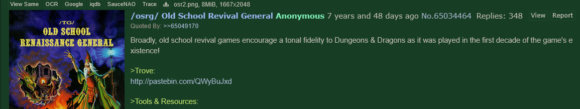 >>97933154That is a rather arbitrary "requirement" honestly. Also OSR wasn't about 1e, but rather pre 3e games now unsupported band out of print.