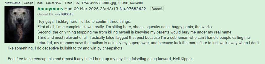 >>97941957Trollcow fits you perfectly. You're a troll and a lolcow.Your fishfag shit is hilariously stupid, and you've sunk-cost fallacy trapped yourself into calling everyone that. And then you have to explain why you call people that, and it's all because you told a boring story about your players going fishing in ACKS, people calling your story boring, and you going into a total psychotic episode where you called everyone "fishfag" that has persisted for months now.The best part is that fishfag was "everyone who didn't like ACKS", but because you're such a dumb troll (and lolcow) you went ahead and started calling everyone who disagreed with you about anything "fishfag." That even includes the janny who was originally deleting your posts, with you claiming the janny was also your fishfag.It's kind of ironic that after the mods got doxxed and some change in the moderation team made it so your status went from a delete-on-sight troll to a protected one, because there's preserved rants of you screaming at the mods for deleting your posts. Now, they've really just let you hijack and shittify the /osrg/, a complete 180° in policy, and it's actually kind of sad that they thought the situation would improve and not escalate by indulging a troll.