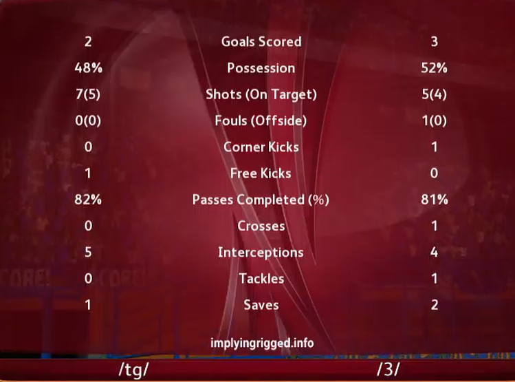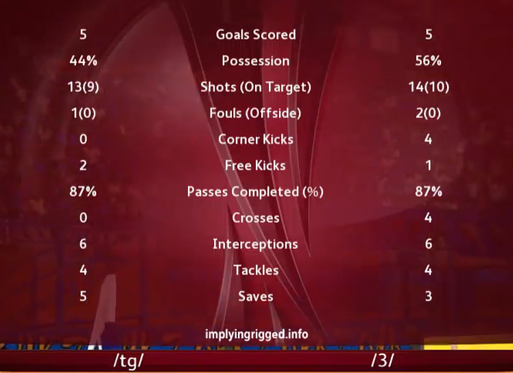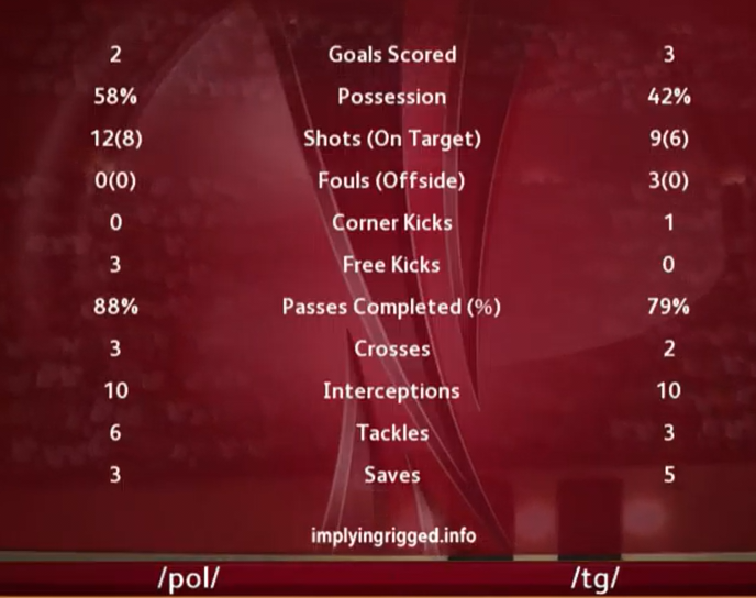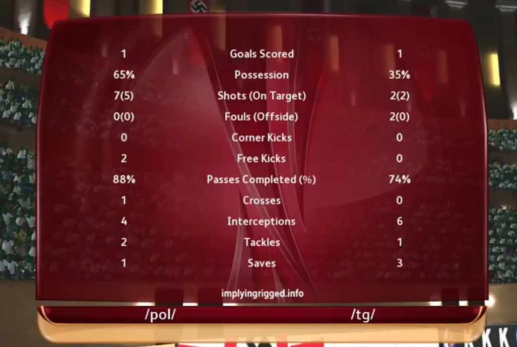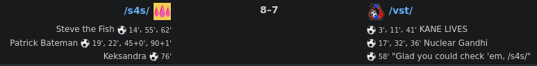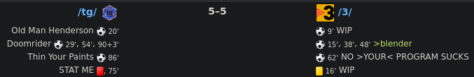 We brought it back, with Tankred enduring his way to the Man of the Match The Book and Doomrider joined Gork (or Mork) in scoring and gave us the margin to survive Epstein's goal as the game drew to a close. This kills /pol/, but we'll need to see how we do against /u/ next Saturday to see whether we make the knockouts.