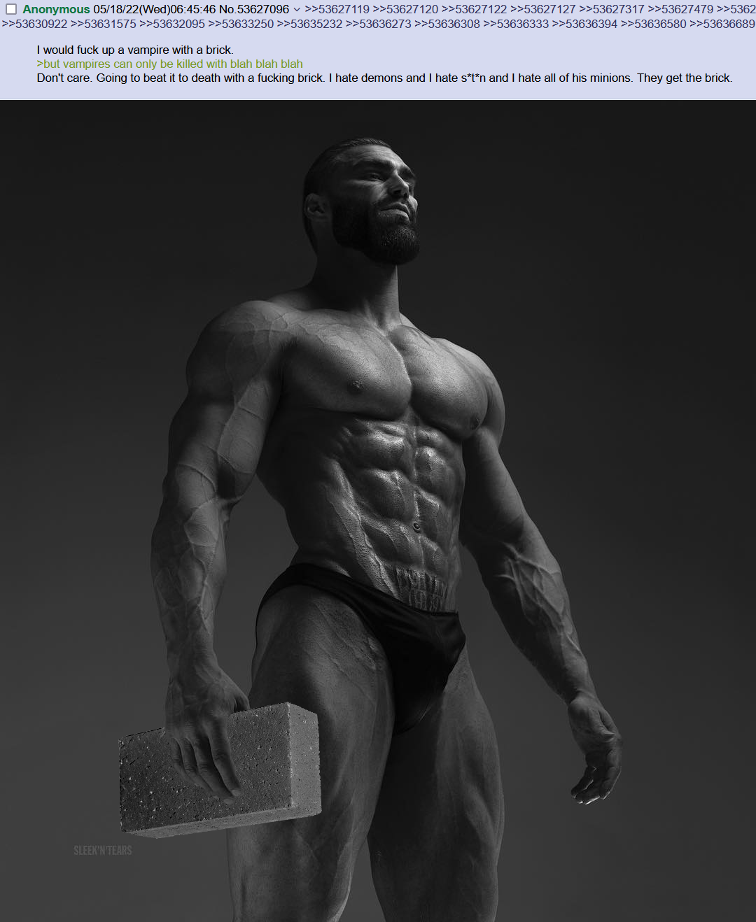 >>97947753As a d*mon hunter Cainite, I approve this message. If getting hit with a brick is necessary to mog and squash d*vils, its a sacrifice I'm willing to make.