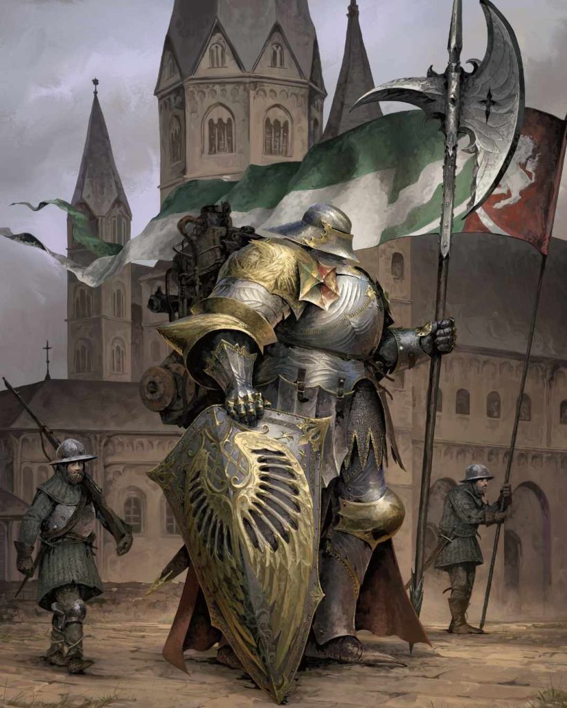 What-if concept for communicant in mechanized armor by Qsy on bsky (the guy who did a lot of the item illustrations in the core book)