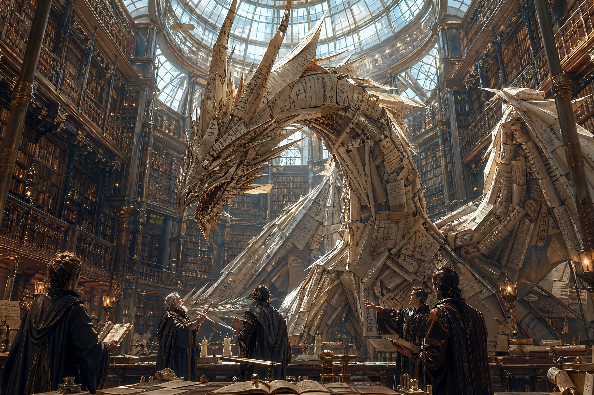 Paper Dragon in natural environment (library).