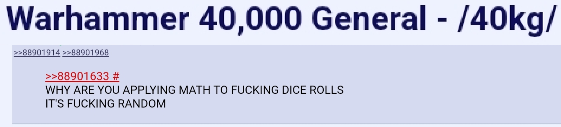 >>97948871what if the emperor was genuinely bad at what he was trying to do and caused infinite suffering for basically no gain to humanity? wouldn't that be grim? and dark? what if his incompetence led to him being worshipped, the thing he wanted least, and humanity regressing to medieval barbarism and their extinction almost guaranteed? wouldn't that be... grimdark?>um no actually hes a noblebright god and its all according to keikakuHmm... have you tried another franchise like Star Wars or something? That might be more up your ally.