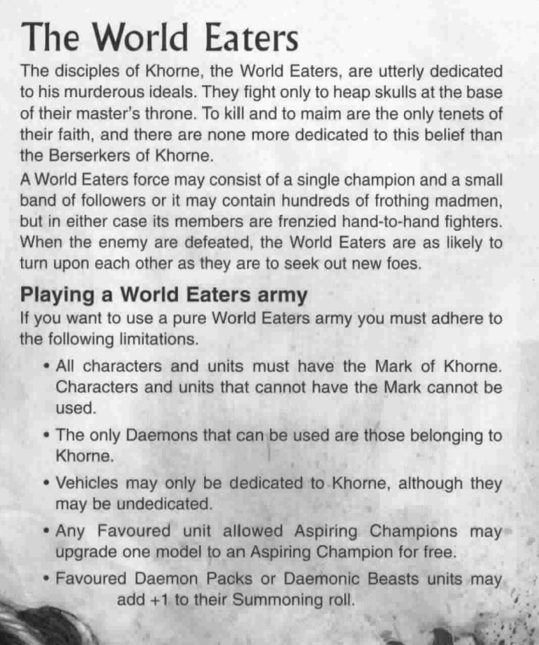 >>97948957It's not like any of those four had a separate clear cut identity from CSM before getting their codex. World Eaters were just the "play lot of berserkers" faction.