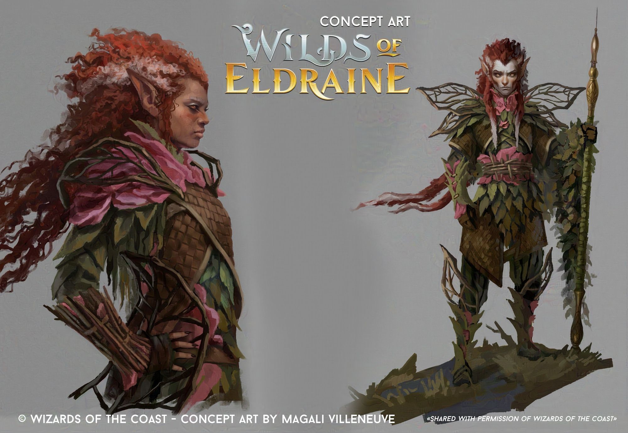 Villeneuve is just a fun designer.>Werefoxes were part of the Beauty and the Beast archetype. There was no way I would leave that part of the push unexplored. Turns out my version of these very peculiar elves remained as the official one in the end. They allowed everything I like to do : working on strong silhouettes, mixing organic textures into a coherent ensemble. Look closely : not one piece of fabric involved. Only leaves, flower petals, wood, vegetal braiding, a touch of leather. I wanted them to feel like an autumn forest. The funniest part was definitely to show clearly their inner fox nature. It is especially obvious with the concept on the right, where it takes a second look to make sure whether we're looking at a humanoid's face or not.