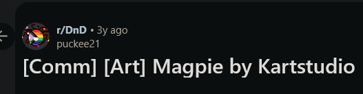 >>97950723>puckee spamming his commission againhttps://www.reddit.com/r/DnD/comments/z8dw3w/comm_art_magpie_by_kartstudio/https://desuarchive.org/_/search/image/F-YogEcgXT9pq5W4sbU5uw/https://desuarchive.org/_/search/image/jynultXDc4JJ3_XSM1WuPw/>combined 95 times