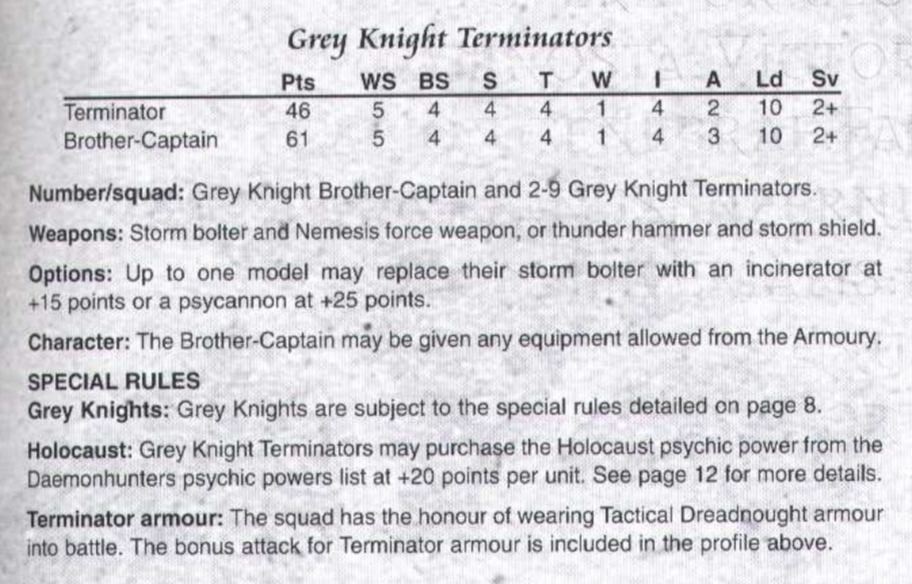 >>97958342Imagine if Grey Knights were 25pts per model, had no AP on their melee weapons, and the heaviest weapon they could carry was a S6 Heavy Bolter.Stormtroopers were absolutely essential for the army to function, along with some inducted Guard squads for firepower. But the Knights themselves were horribly expensive and extremely inflexible. >>97959722> daemon hammers were character/sergeants onlyOne of the most-missed options in the book was that Terminators could swap their wargear out for Thunder Hammers and Stormshields. But it still didn't fix the shooting obviously.