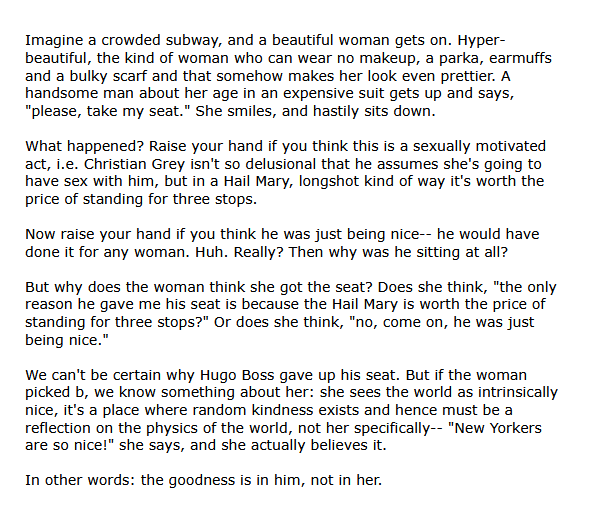 But, as the anecdote points out, if this handsome man in a suit was really just being polite and would give his seat to anyone, why was he sitting down on the already crowded subway car when she got on and only stood up the moment he saw her? Someone who would really give their seat up for anyone wouldn't be sitting. He's not Prince Sattva using his body to feed a tiger's cubs, but her perception of reality is subtly warped by her experience so she thinks this handsome man is just being nice because everybody is nice to her, she thinks people going out of their way to be nice to her aren't interested at all, hence her lamenting about her love life