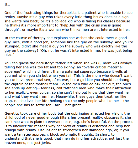 This is specifically an anecdote about a woman complaining to her psychiatrist about how she has trouble finding men interested in her, including those like the handsome man on the subway, which baffles her psychiatrist because "You DID meet that guy, what do you mean?" it's not just that she thinks the man on the subway was being nice to her, it's that she thinks he was JUST being nice to her, because she's so beautiful and has been treated a certain way because of that beauty her entire life she only recognizes interest and romantic pursuit from people who are explicitly overt and vulgar about it, because she thinks everyone else really is just kind and helping her for no good reason.