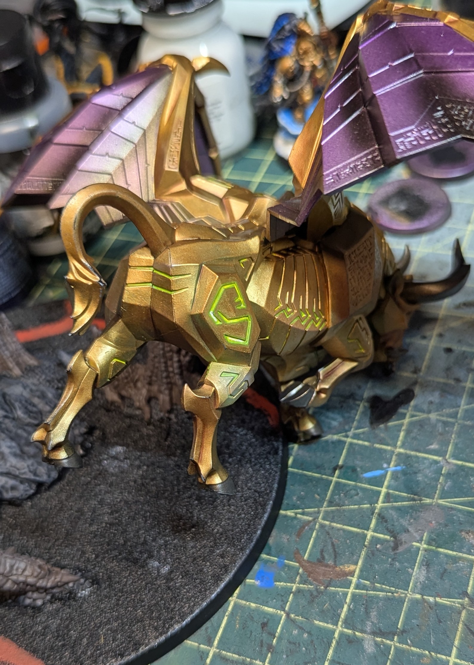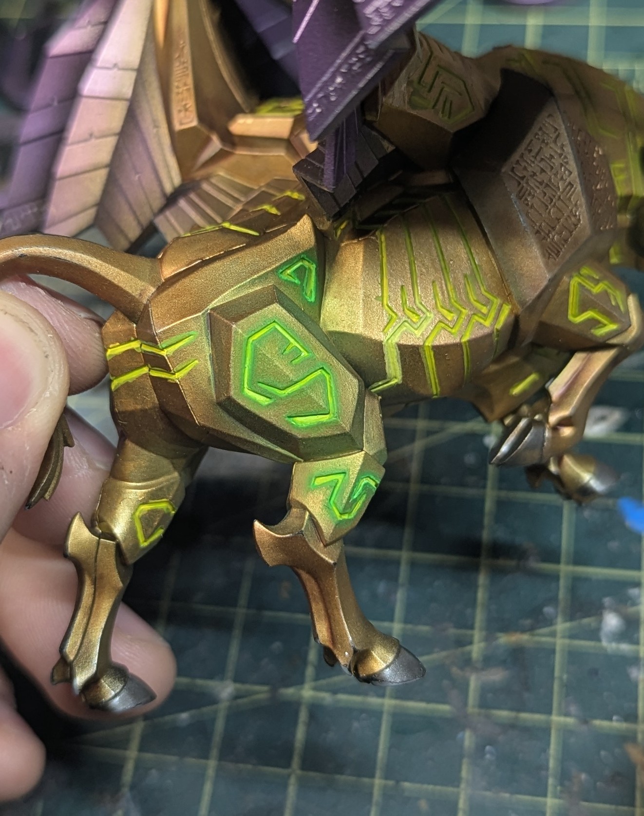 >>97963196Well, I've done glows before (picrel), but I'm running into trouble with this specific model due to a number of reasons. I'm mostly going for just bright runes instead of a full glow now, as someone else pointed out that green on gold isn't a great place for a full-glow. And I unfortunately don't want to change the color of the golden bull or the green glow, since they're both tied into my scheme.And also unfortunately, I can't get the level of detail I need for these runes with an airbrush. I've been able to do some precise work with it but when I tried on this guy it was taking too much color away from the gold (See:>>97958670).Anyway, as for your mention of darker parts, are you suggesting I take a slightly darker green and do a fine highlight around the edges of the rune?