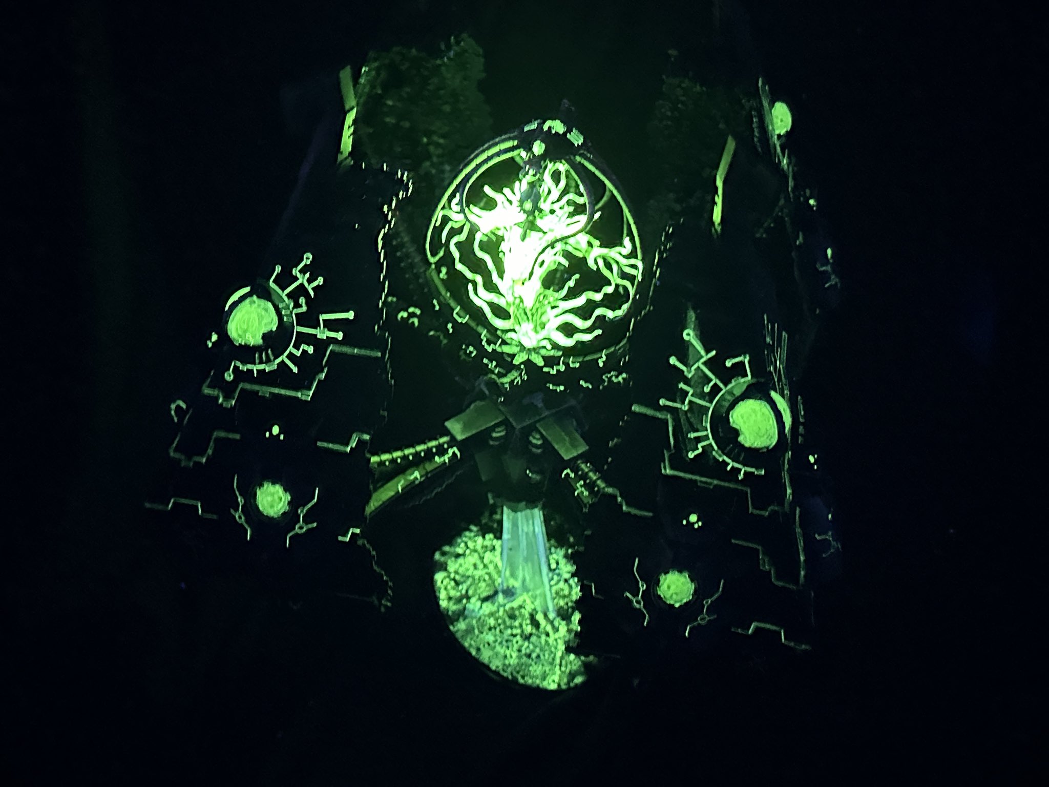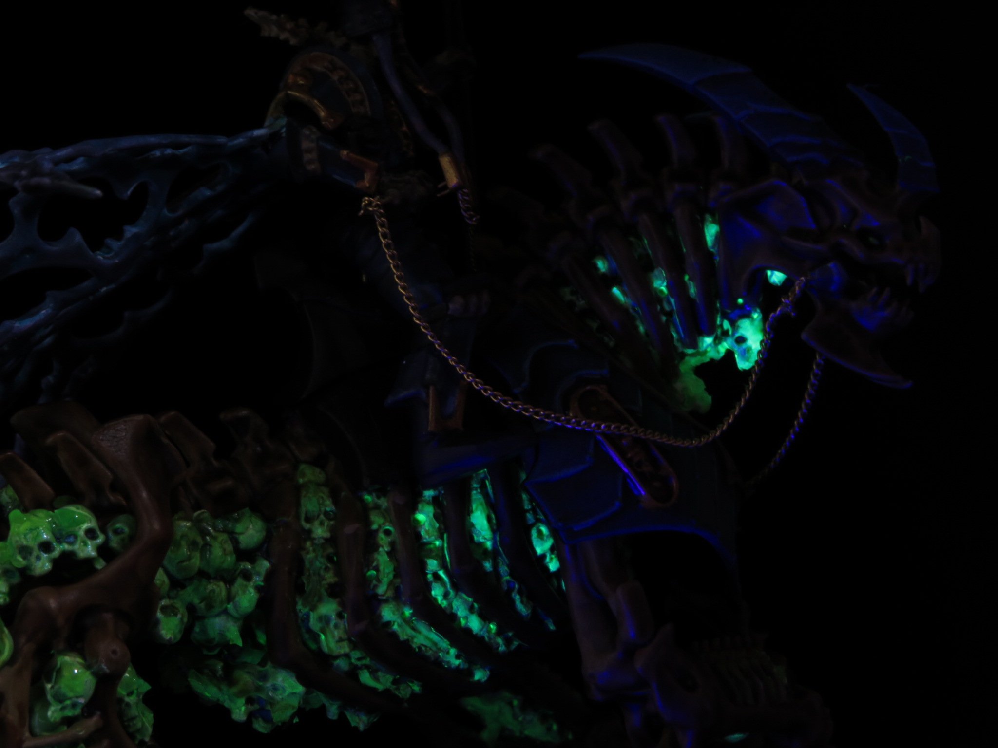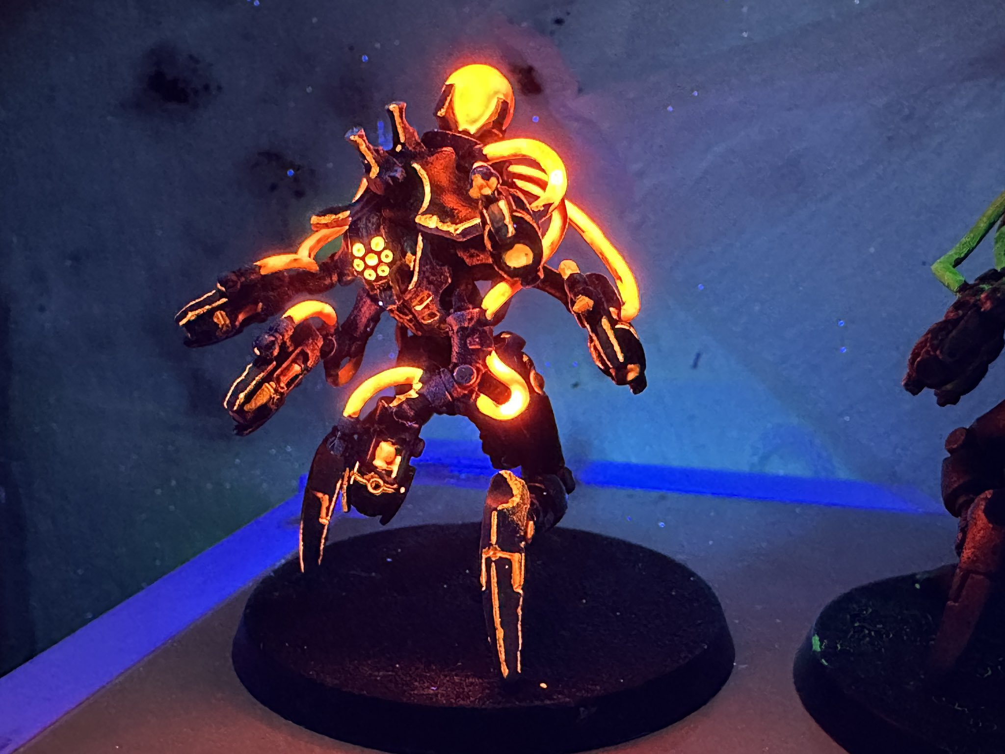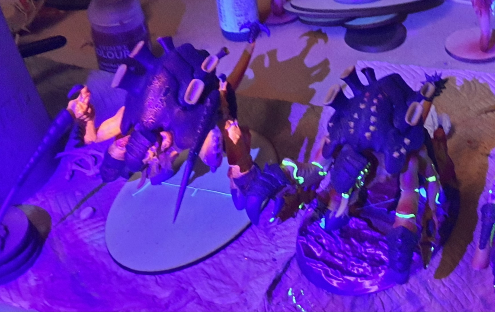 >>97966954I really need to do updated pictures of my carnifexes, but here's an old WIP of experimenting with paint schemes. I just used a tiny black light torch that I use for resin touch ups, but the effect can still be seen with lights on too. Fluorescent paint with crackle on top was a fun effect for the carapace, but I wasn't a big fan of the plasma glows