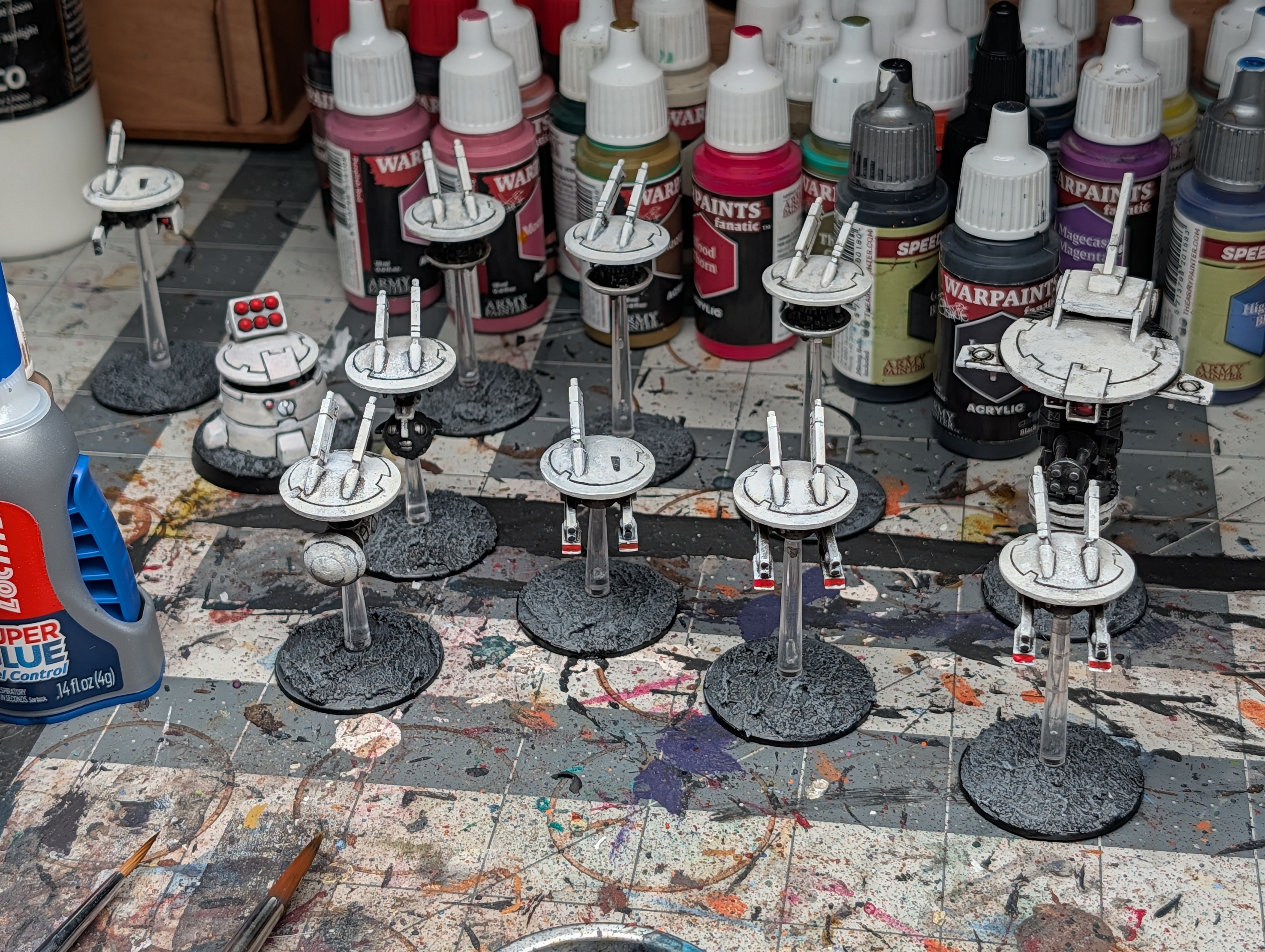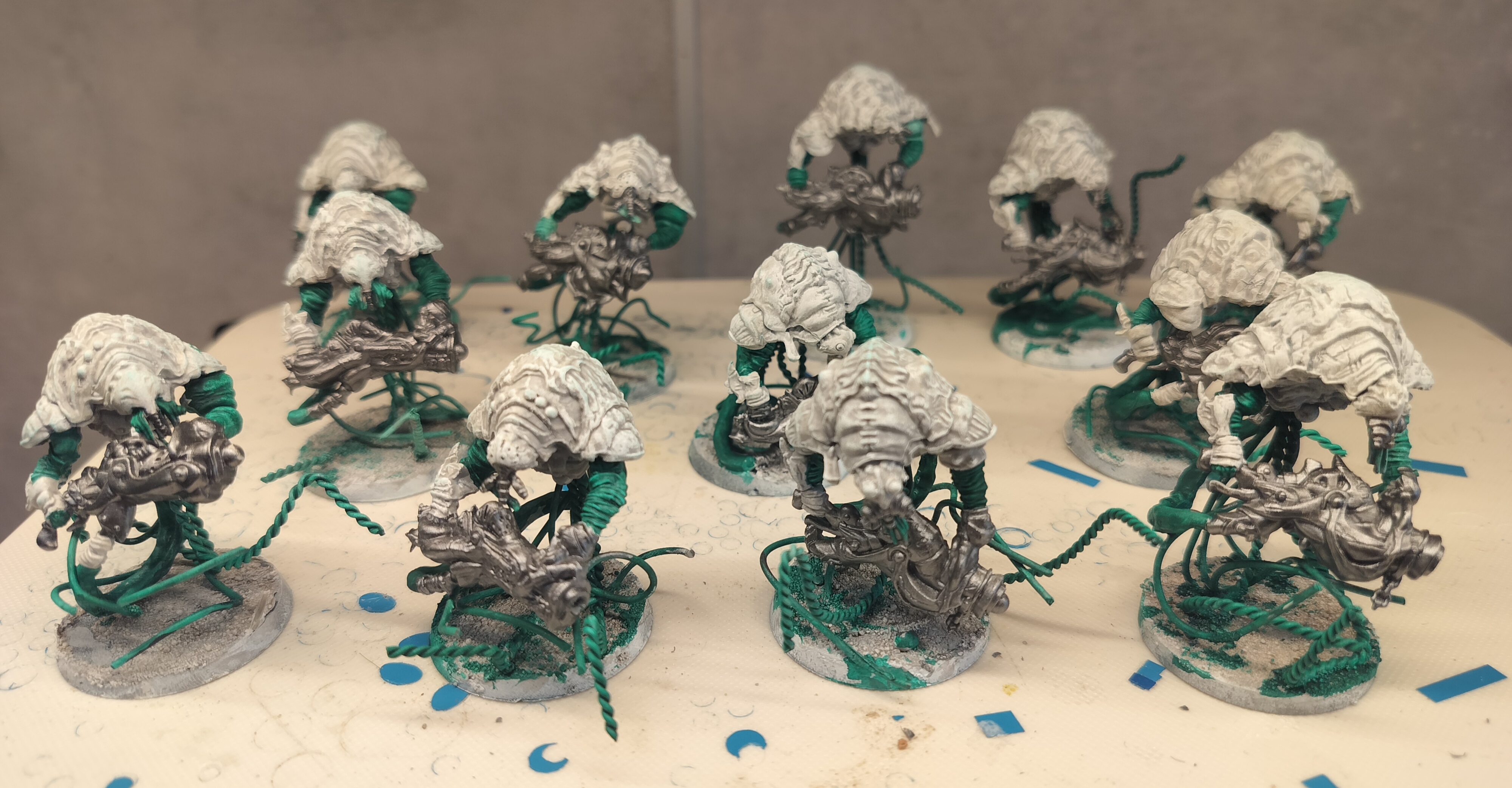 >>97962146I primed the drones and drybrushed a few layers of pale colours. Next step will be painting the tentacles and pipes green.