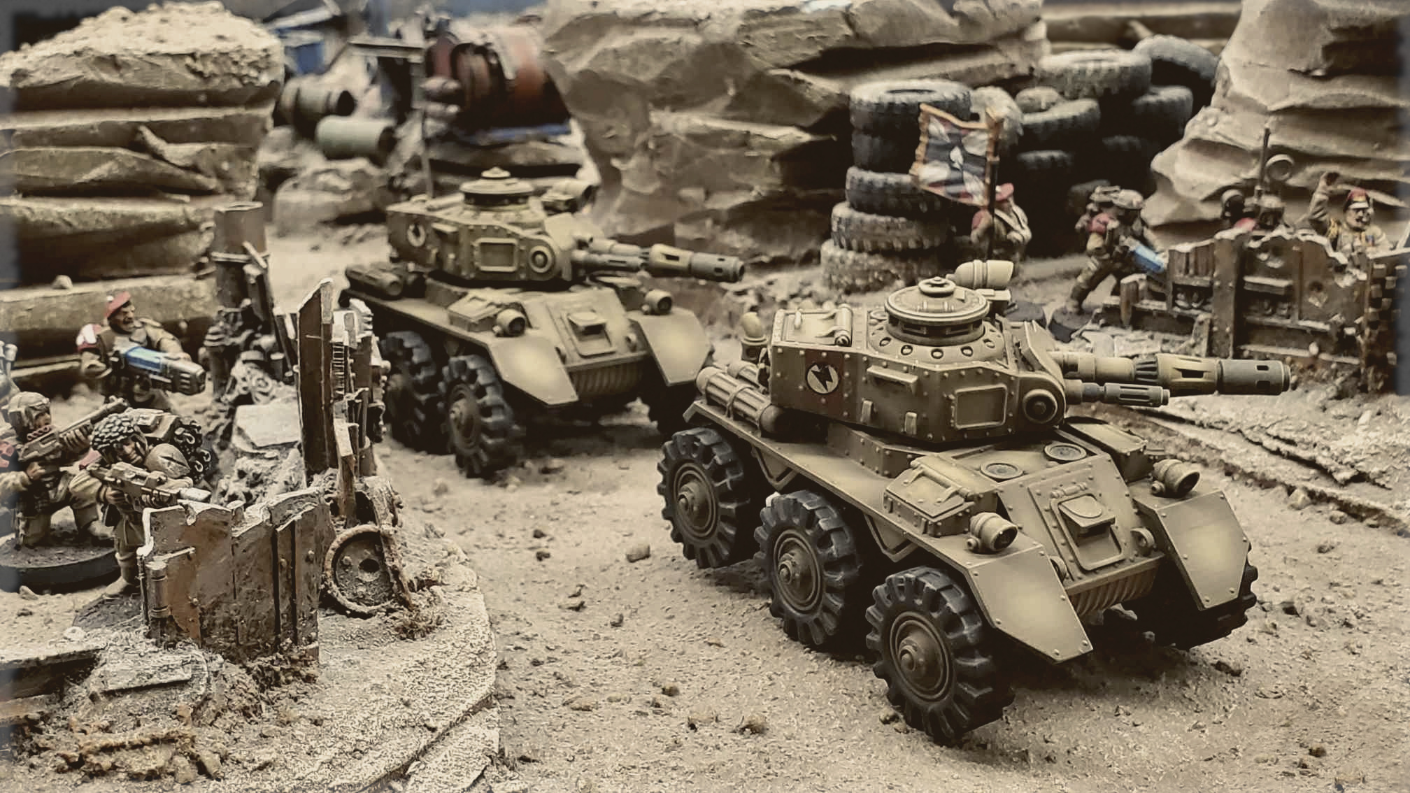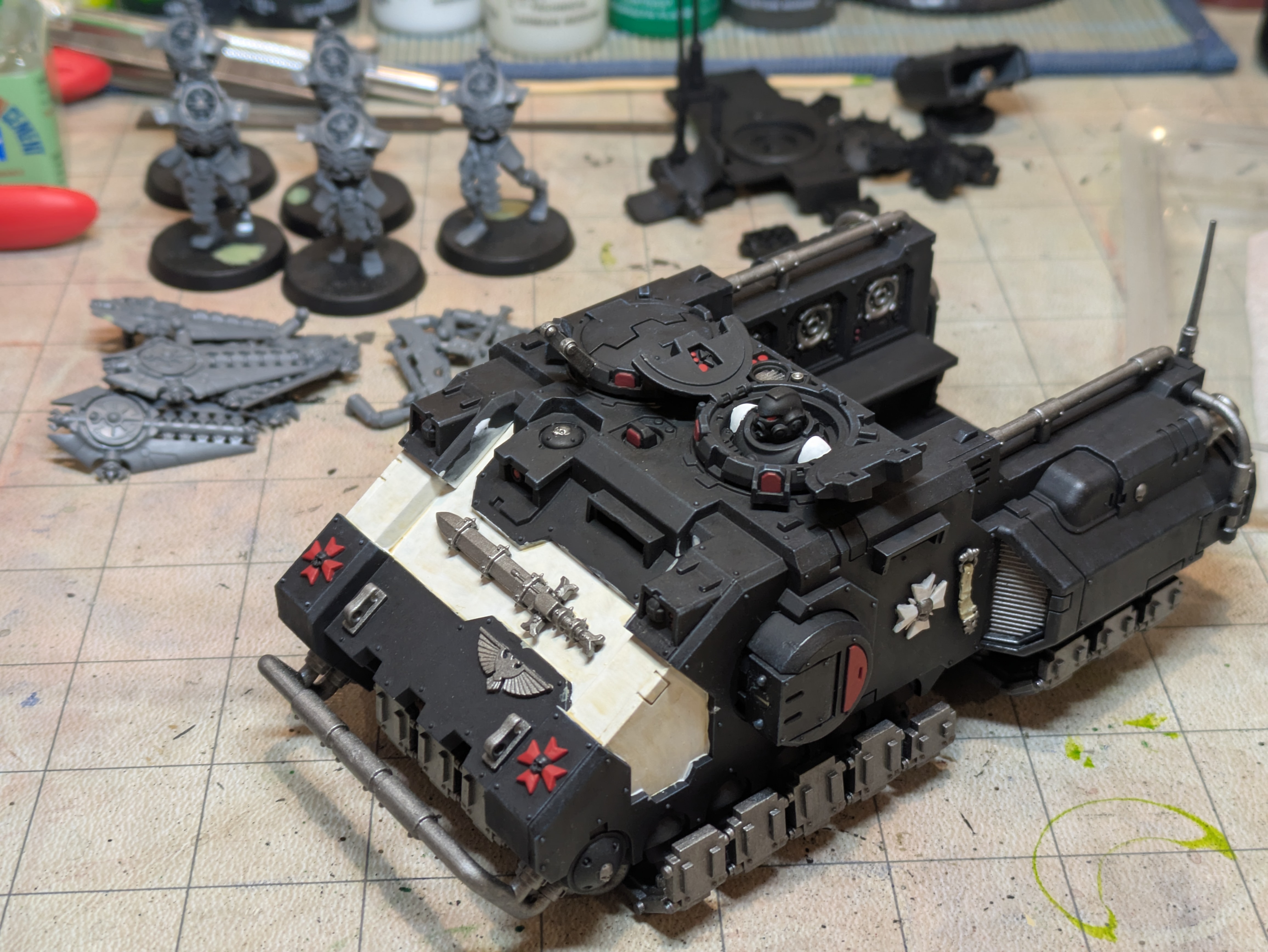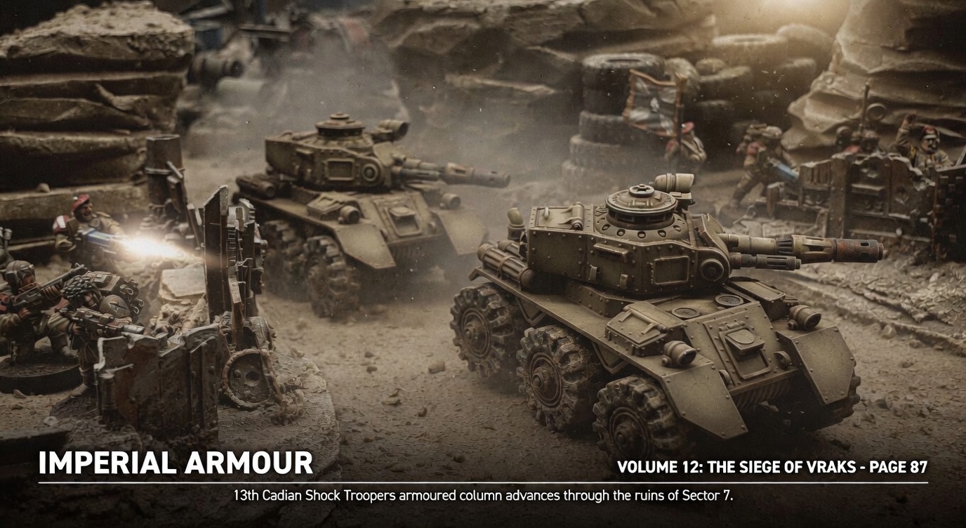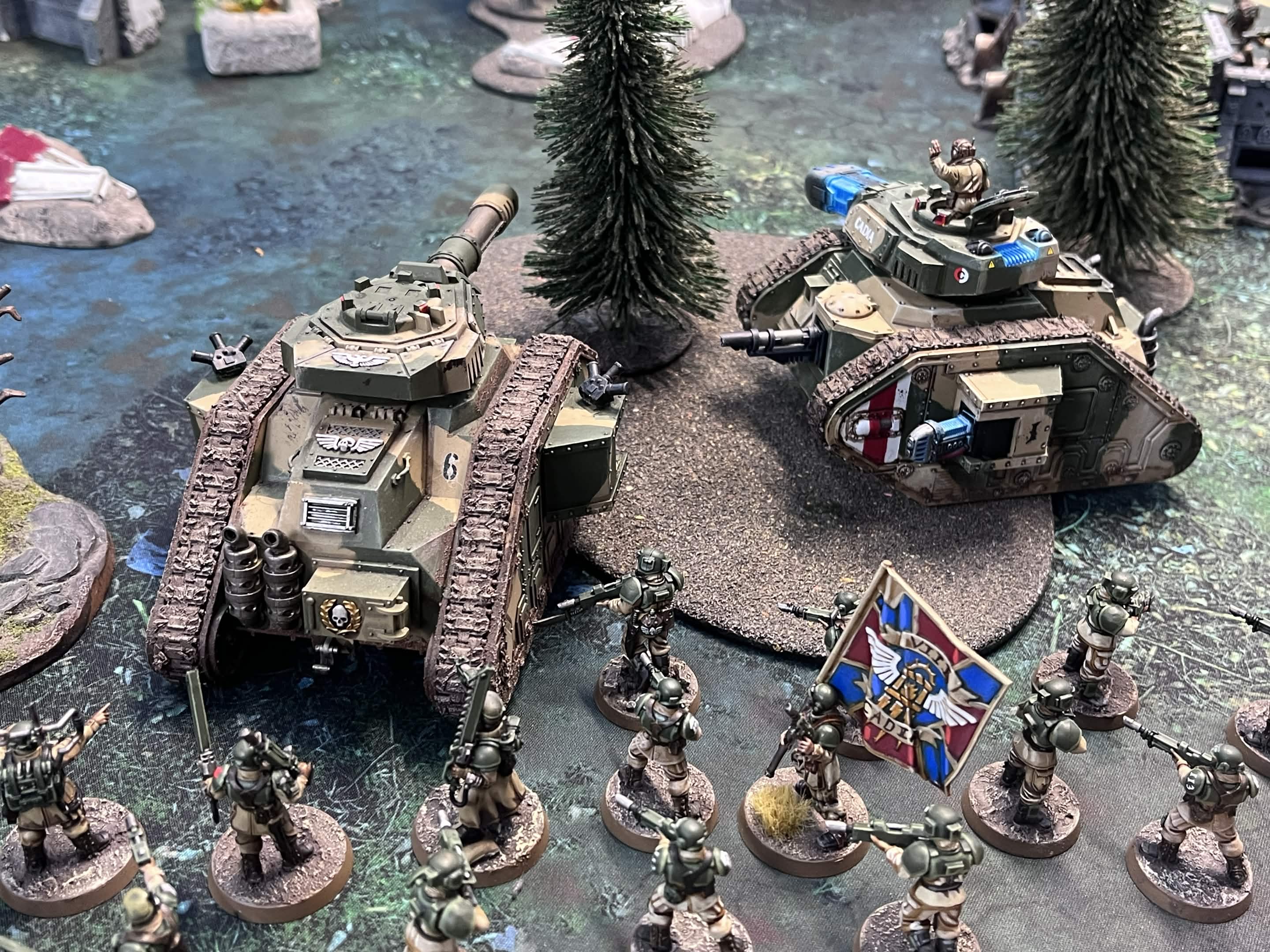>>97970618You should paint white stripes on your old cadians and run them as whitshields/conscripts, or vice versa>gold laurels and white skull behind the tankThat's the kind of little decisions that work beautifully, most people will just paint it in one color.Beautiful models.