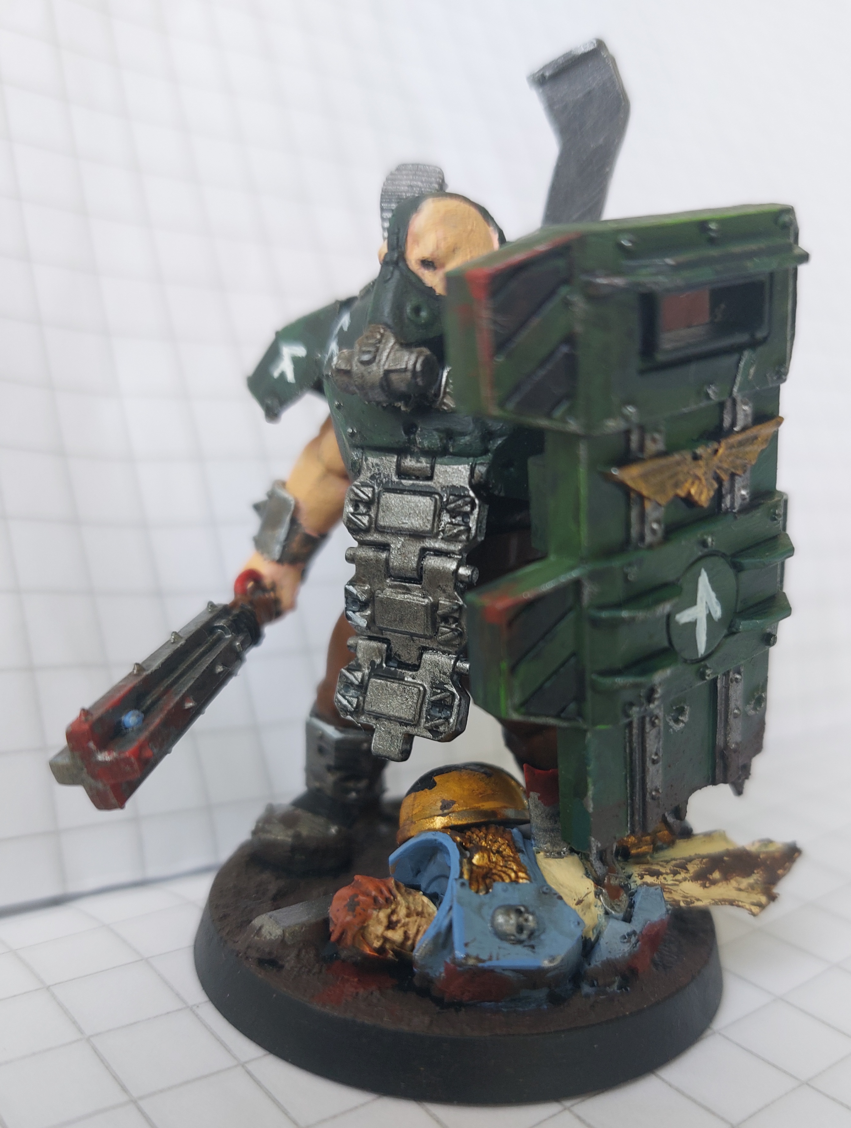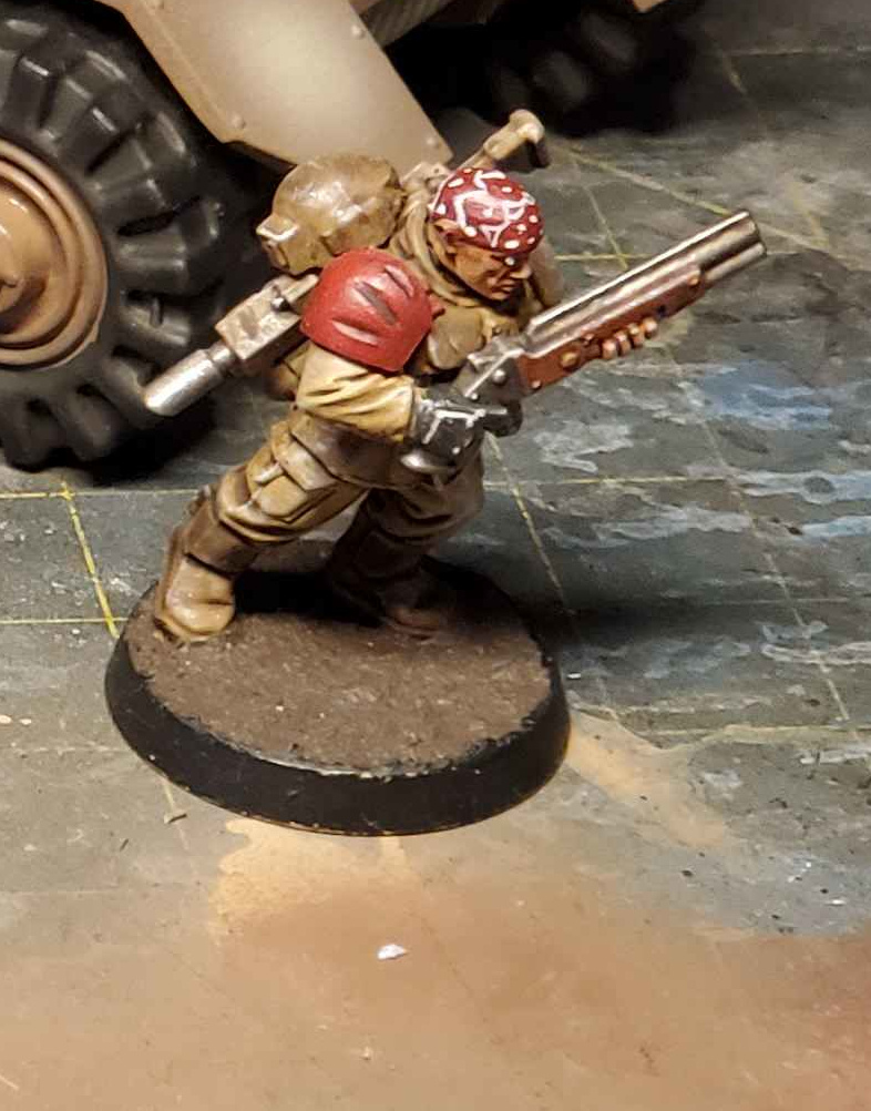 Coming back to 10th during its swansong, I am finding a lot of fun in it. I've had more Imperial Guard type moments in these games than I have in other editions, things like marching a big squad onto an objective for a few victory points knowing they'll be gunned down soon after, or holding a monster tied up in melee for turns on end. Painted up the Command Squad member w/ the banner and the Russ executioner for this game.