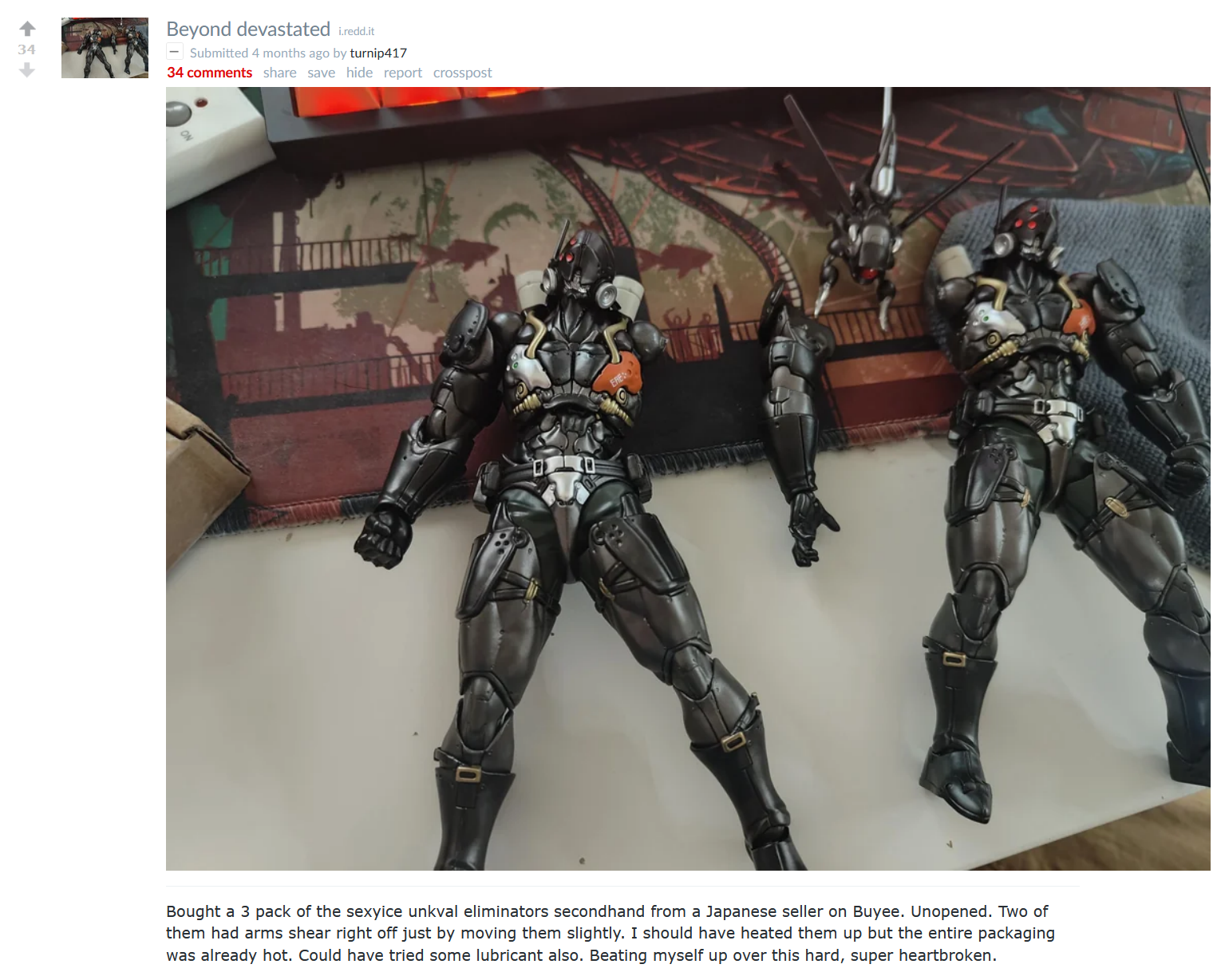 >>11673249>If their quality is bad, that's news to me.i guess you weren't here from 2015 to 2020 when the line was new and popular. Lots of complaints.The last time we had a MYthic Legion General was in 2024, because an entire wave came out defective and 4H shat on everyone who publicly complained. It then merged with the fantasy general due to how few fans were left.I think you're better off buying Chinese weapons sets, because they can't be any worse than 4H's and will be cheaper. If you wanted heads though? you'd be fine, as there's nothing that can really break.here's a pic of a Mythic Legion shield breaking. The figure has loose ankles, so he fell onto the desk, his hand immediately popped off (loose joints everywhere) and the peg for the shield snapped off. A 3 inch fall onto Ikea cardboard broke my toy.And I'm not sure why you hate McFarlane so much. What you see is what you get and their plastic is about as good as Hasbro's. This is why i bought their Blizzard statueshits, because they increased the amount of paint apps on their toys from missing articulation and now i have some really fucking nice fantasy weapons.