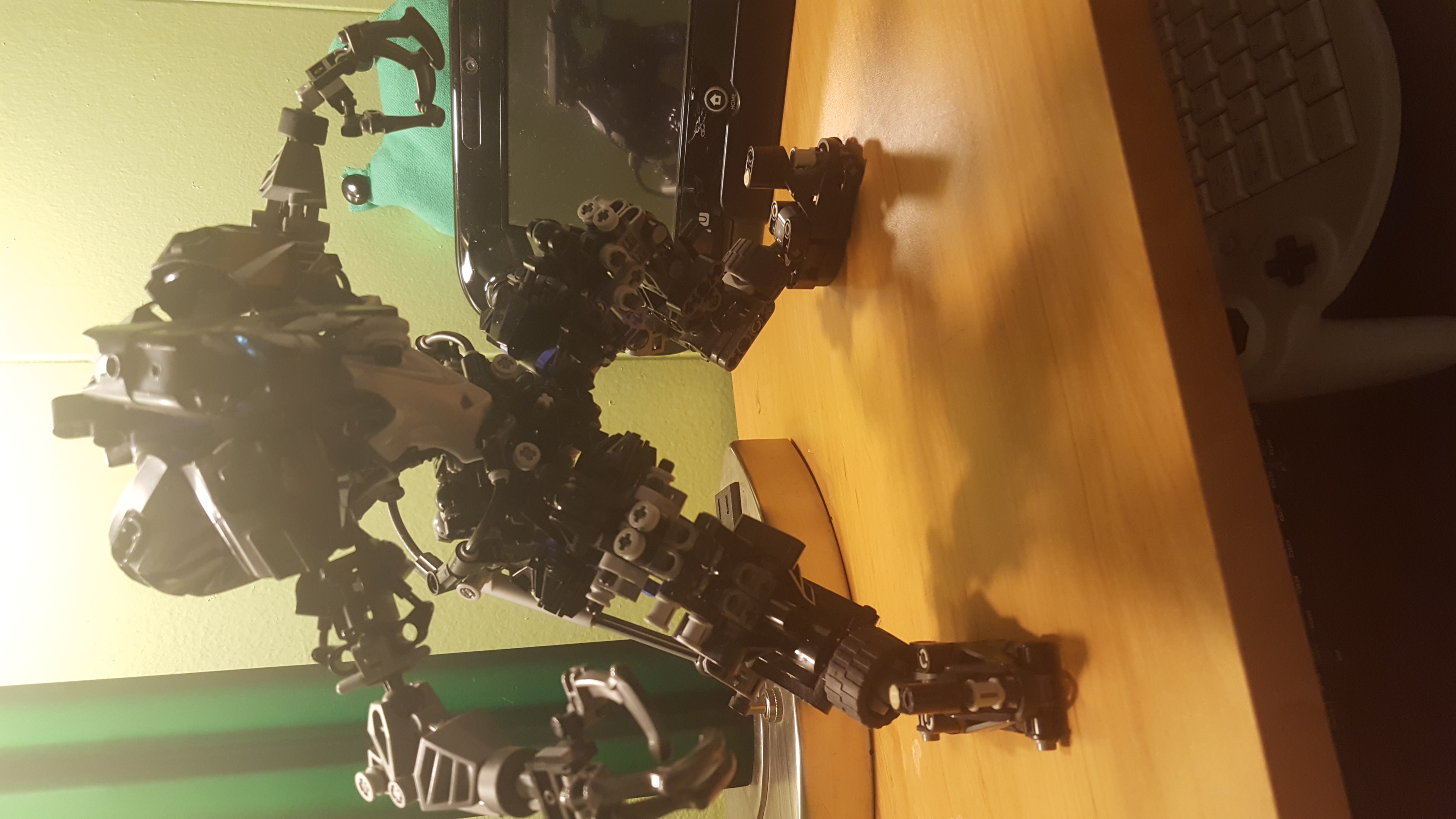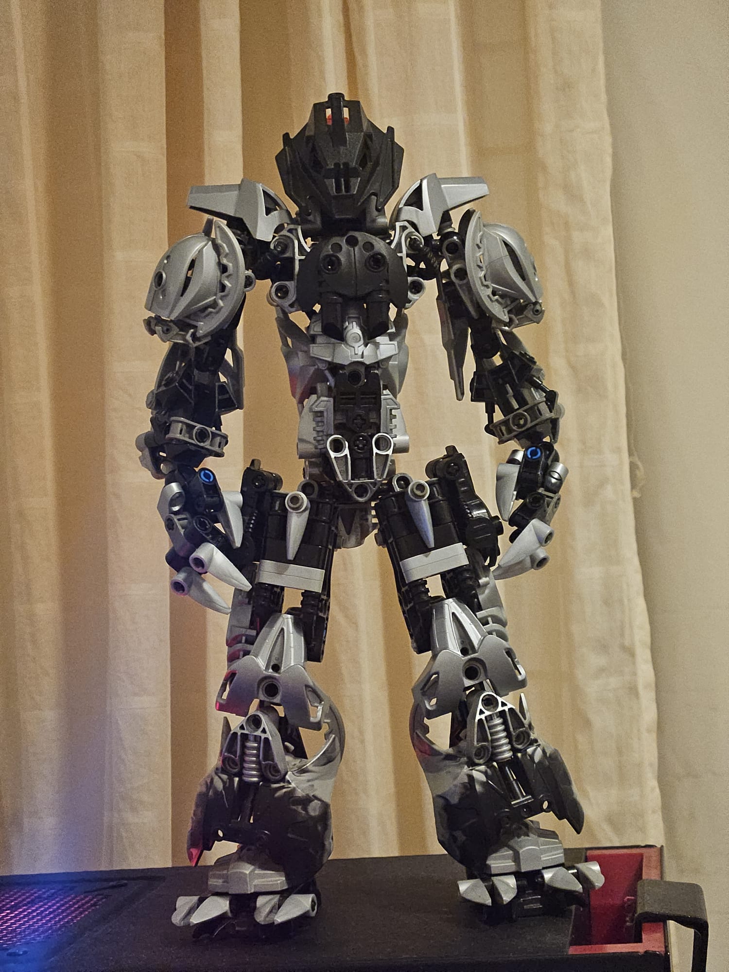 >>11673143>Thats actually pretty damn smartThanks, but I think the problem was that while it stood well, it wouldn't pose well. What I wish existed was a slider piece, like a beam except it's hollow all the way down except maybe a pin at one end, such that a shorter version of the piston axle with its flat head could slide through it. It'd be low-profile and and add resistance to joints that only need a single degree of freedom.>Were you ever able to straighten out his back?I think not. It was only a single balljoint in there, and even if he was always a technically slumped forward it still meant I could rotate the torso. I'm having a hard time imagining if parallel balljoint connections would lose a degree of freedom or not, but that's what I'd try if I were to redo it, and if rotation were lost then a pin with sufficient friction could be used at the hips maybe; 1.5 pin with an axle end plugged into a 2-deep hole would probably be firm for posing with a heavier torso.The main problem with this guy was mostly in the fatass shield-sword in his right hand; those hoses looping through the back were structural, and kept the flimsy shoulder joints up. Piraka thighs as forearms didn't help.>your picI like him. Reminds me of the style of pic related, from a guy who used to post her regularly. Wish more anons were still posting MOCs, even stud.io stuff. What else have you got?