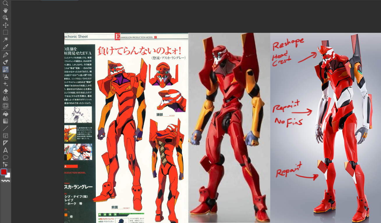 To elaborate on >>11678824, I have an idea that might be kinda out there.I'm really into the End of Eva version of the 02 design, but only one figure exists and it's like 20 years old and pretty expensive online.So I'm considering grabbing a RD Eva-02 and painting some of its parts to match the End of Eva version. After comparing the 2 it actually appears that the EoE design is closer to the rebuilds than I thought, so sculpt wise there wouldn't need to be too many adjustments.Is this idea too far out there or is this feasible? I've painted and sculpted gunpla before, but I'm not sure how similar the plastic of RDs is and I wonder if there's any precautions I should take since they're not designed to be customized like that.