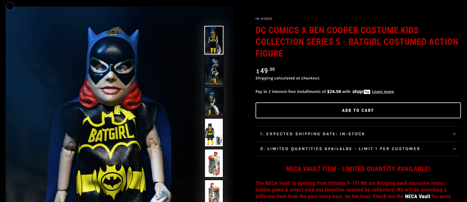 >>11593220Not even NECAnon can justify it. Batgirl, inexcusable. Glow Creature... this could have been saved if it had been the 7" Remco homage. Superman, inexcusable, among a few others. The only ones of "bargain" were sold out nearly immediately, in less than 10 minutes. ...Wonder if they'll be doing the christmas thing again. I think you're right though, it was only done last year as a rushed fix to their pants-darkening mistakes. On a plus side, they were only late getting some of these up 18 minutes after drop time, whereas the christmas one... man... they were late by HOURS on some of them. I humorously chalked that up in my head to them having a week-long office christmas party where everyone got hammered.