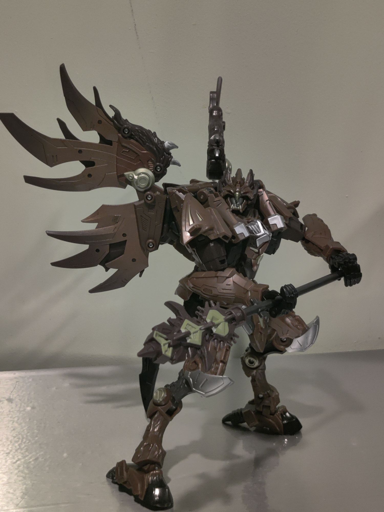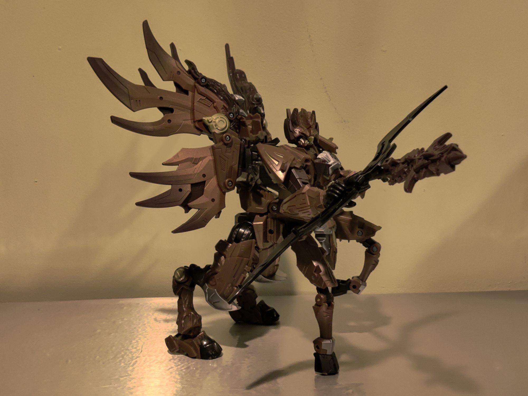 >>11594874Dragon mode. This isn't really much of a transformation - it's just his bipedal robot mode on all fours with the tail moved down slightly and his robot head tucked into his chest while the dragon head hanging off of his back is folded down. It's not the most horrible beast mode I've ever seen, and I was a fan of the Prime Predacons, so it doesn't bother me too much. Technically, the ankle spurs on his hind legs are supposed to fold into his hooves in this form, but I'm keeping them out to further differentiate it from his next form.His spear plugs into his back for storage, with the Mask detaching and reattaching to one of the pegs on the spear handle's side with the other peg tabs into a slot above his tail cover; the spear can also be tabbed into a slot on the back of either of his wings.