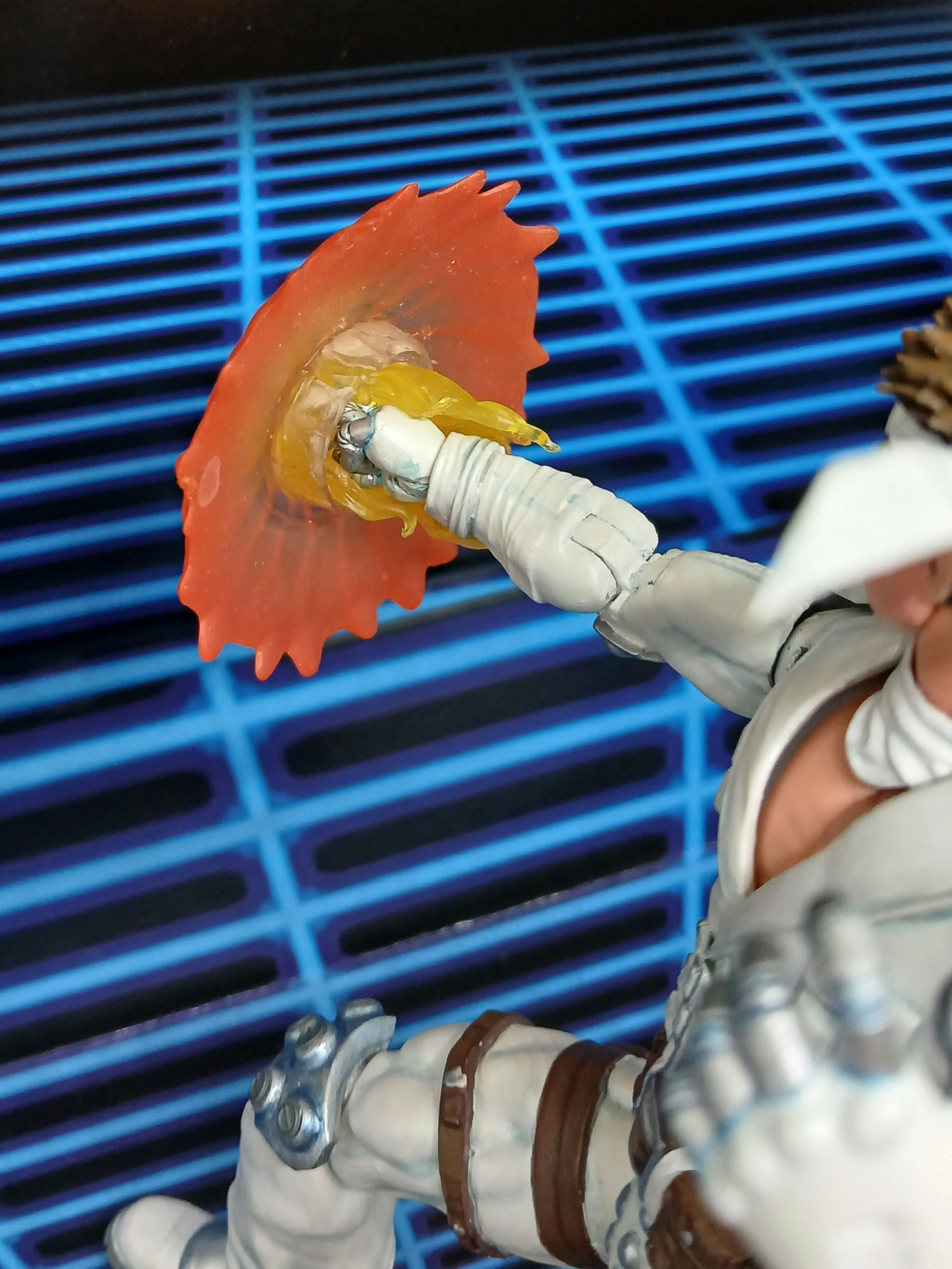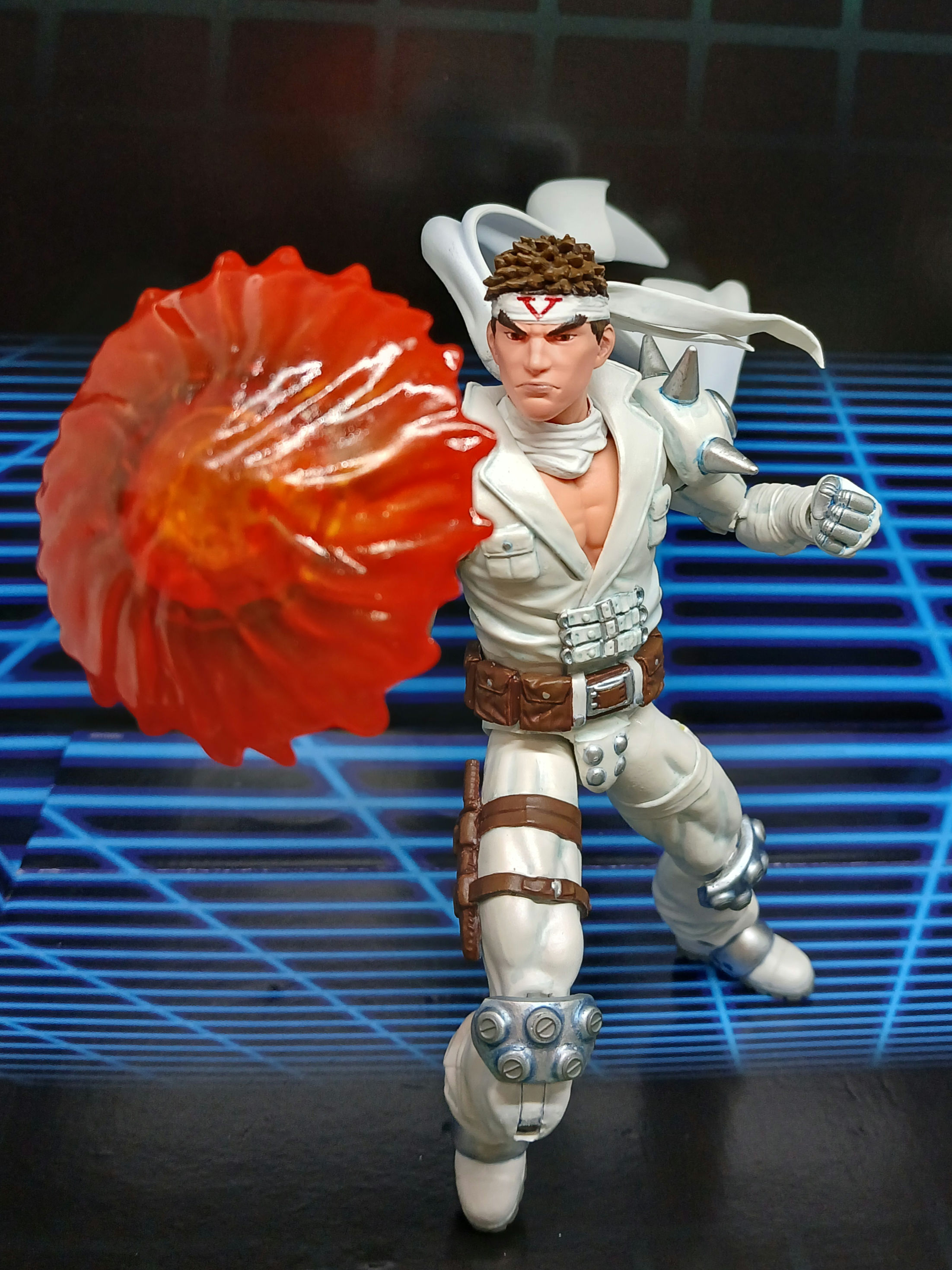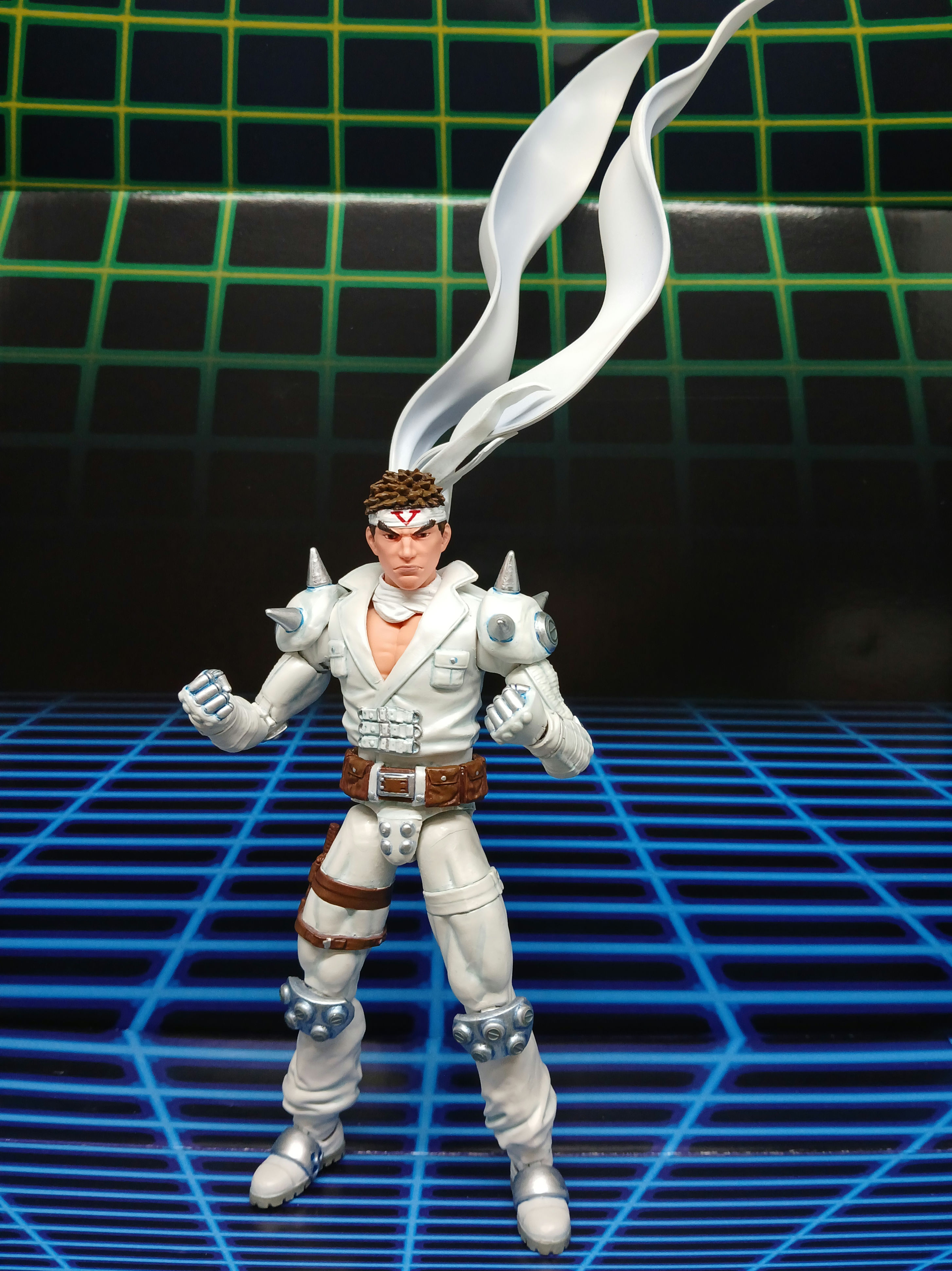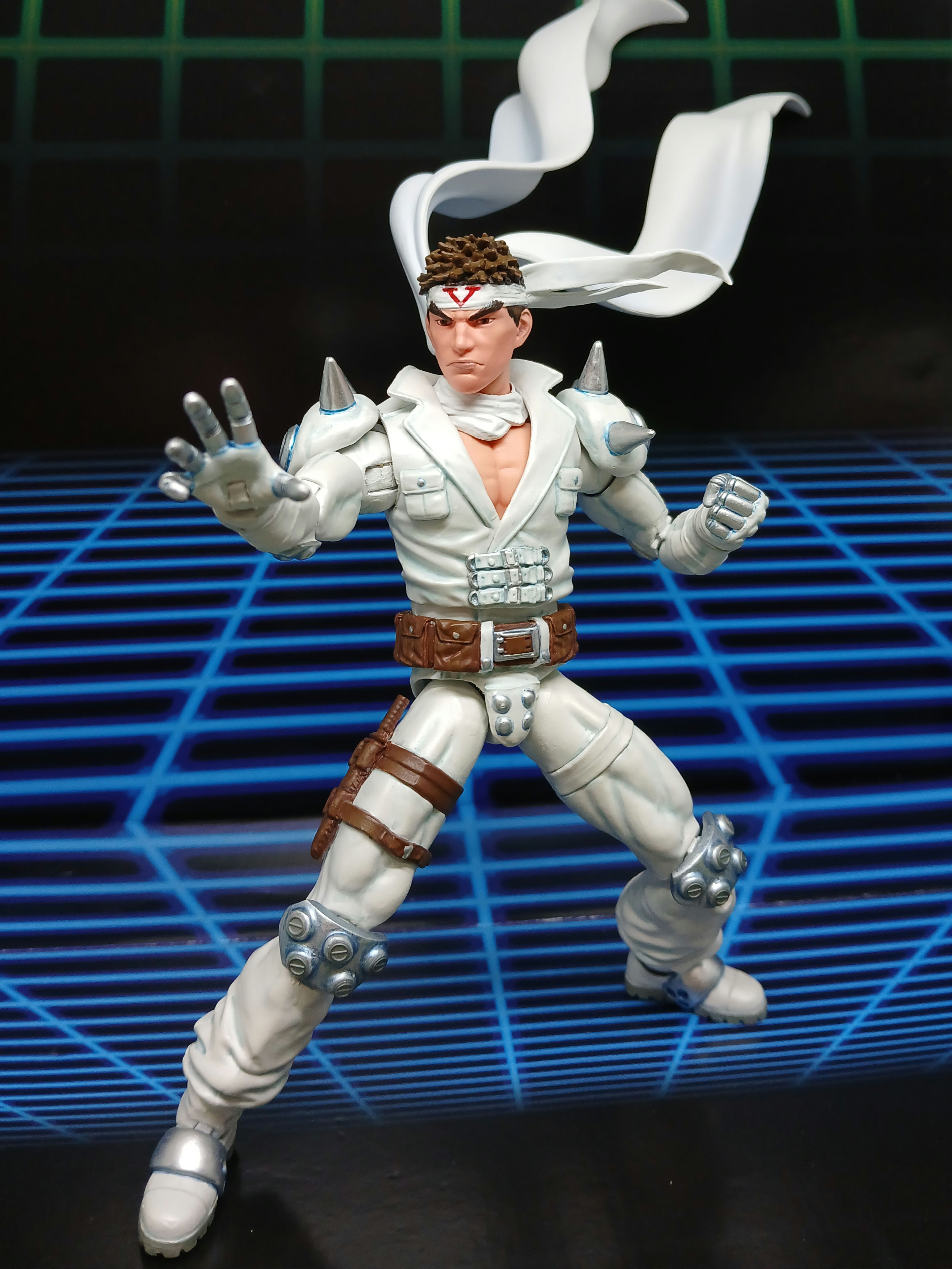 Jin is pretty much finished aside from a new scarf (on the way) and working on his punch/kick fire effects. He was made from a Secret Wars Beyonder upper body, 3d print modded Ryu head (ebay), Solid snake bandana, AoA Gambit arms/legs/feet/belt, 2-pack Secret Wars Dr Doom hands, Star wars Krrsantan shoulder pads, UV resin, various fodder knife/pouches/straps, metal Gundam caps, and a scarf made by putting bendy weird between two pieces of white duct tape. Unfortunately the tape eventually starts to split apart so I ordered a Figuarts Apocalypse Zero Exoskeleton figure to swipe the white articulated scarf from Jin is painted with Testors Aztek pearlescent white, grey-blue shading and details, then sealed with MTN acrylic matte so he can be posed and handled. I'm going to add whatever I can to him over the next few years and want to make a Blodia fist at some point!