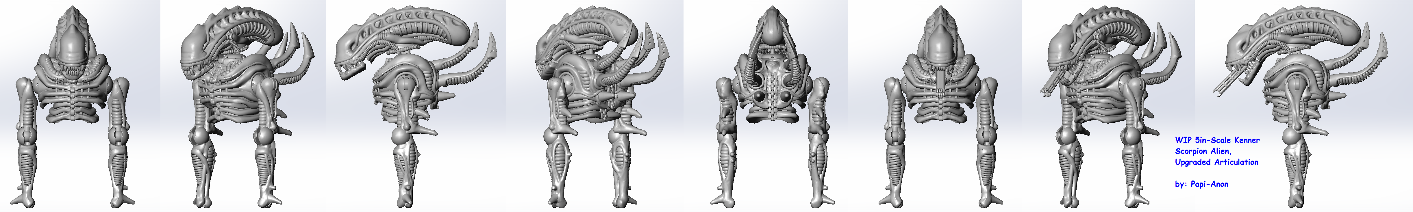 >>11603339Ah, well, I’m trying not to deviate too much from the Kenner figure’s sculpt and proportions, and the original Scorpion Alien had not much of a neck to begin with due to the exploding gimmick. Basically the rim of the shirt neck locked the collar of the chest pieces together when the ‘heart’ inside them clicked into the trigger-sear in the hips. Look up eBay listings of original Kenner Scorpion Aliens and you’ll see. The Kenner Warrior Alien from the Aliens vs Predator 2-pack is actually the one closest to the original film Big Chap from the Kenner 90s line, including having a slightly taller neck than the Scorpion and being much leaner.