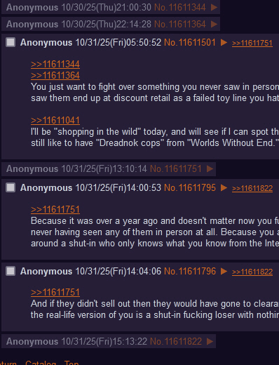 >>11610972>You're just another classic toy-snobNo, you're just another argumentative head-up-his-ass who can't see what's really going on but insists on your own version of reality being how things are. You can't deal with the TRUTH that Cobra Commander was available for several weeks before selling out because that undercuts your bullshit line about him selling out "faster than shit" and renders all of your future arguments suspect. I'm not a toy snob, I just can't stand childish statements like yours. Grow up.