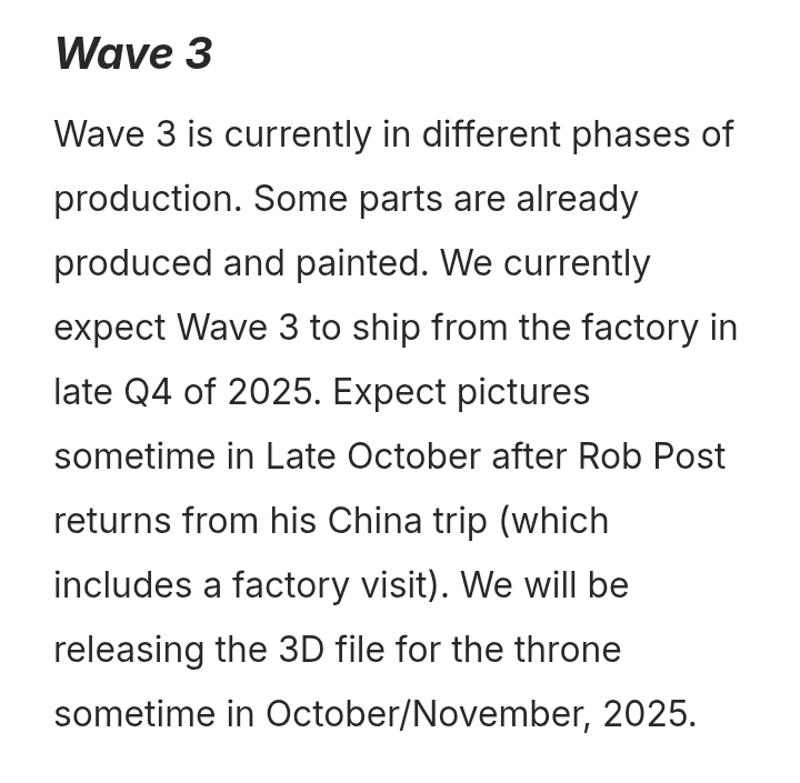 >>11604301Picrel is the last update they gave for wave 3 back around when they did the in-stock for wave 2, so fingers crossed they ship from the factory before the end of the year.>Their current wave 4 seems to be more lizards and barbariansShit, these were the ones shown at Wonderfest last month, and they are already up for preorder.https://savagecruciblepreorder.com/Honestly, I think I only want a couple of the snakeman, and I'm not sure how rapey international postage will be for two figures, so I might wait for BBTS to put them up. >it always felt like they planned to have each wave be it's own thing and instead they're just rehashing what's already been released.The reptilians in this wave are an entirely new sculpt from the Lemurians. Much more like snake scales than the pebbly texture of the first wave. Not sure about Kubla Khan because I skipped wave 2, but I'm guessing it's the same.