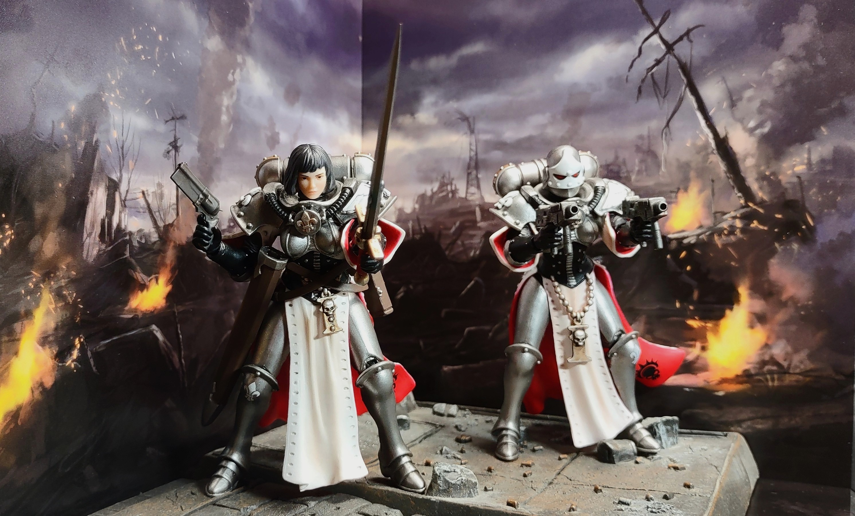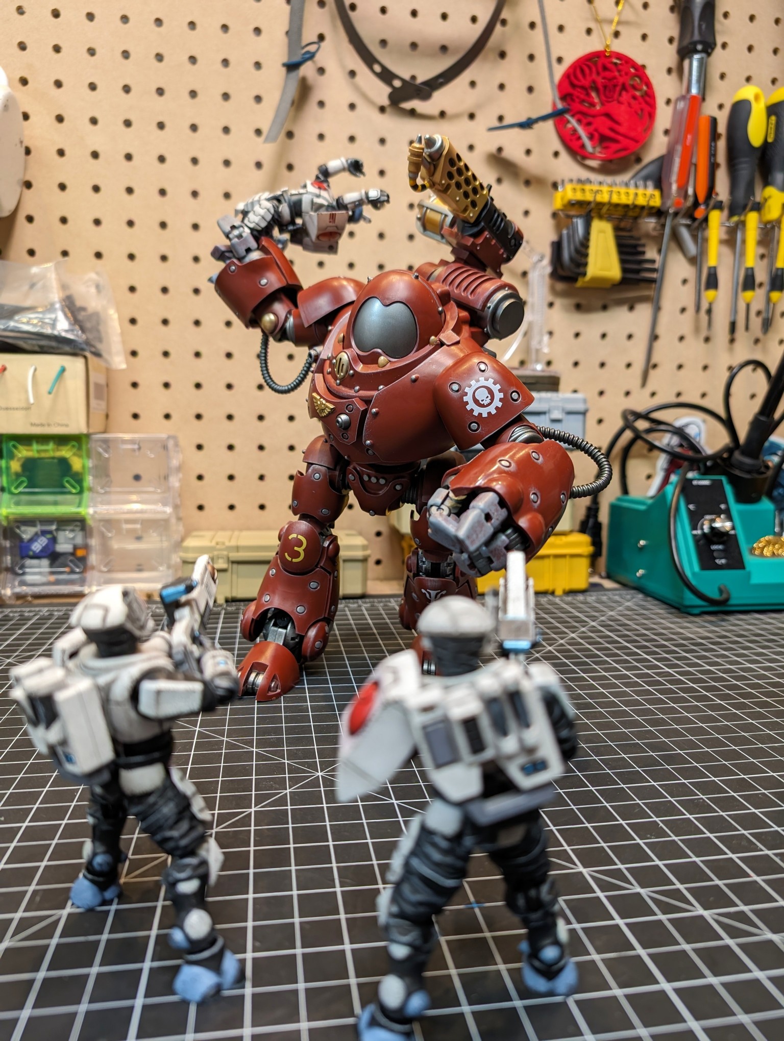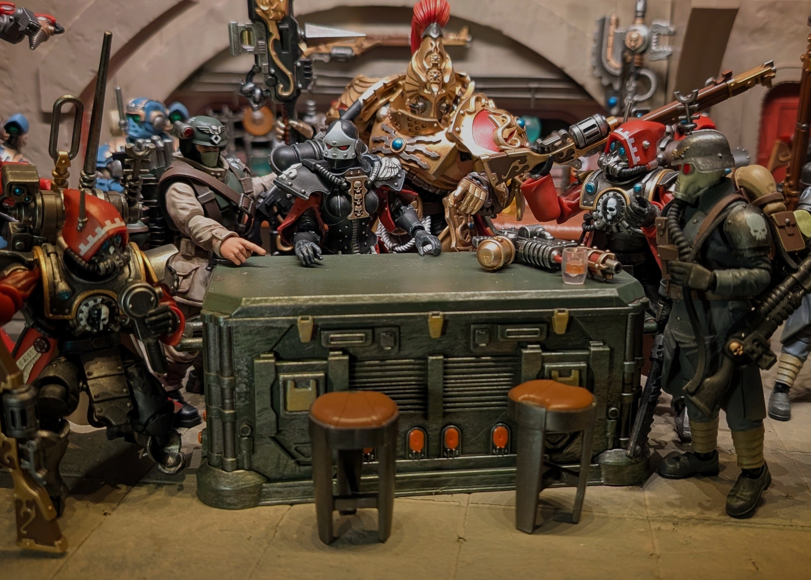 >>11630488My joytoy collection is eclectic. The only thing I've army-built is all the Admech with 8 skitarii rangers, and I 3d printed them some more special weapons (the arc rifle and plasma caliver that joytoy never did) Currently no necrons, but I have a couple of the Kommandos. I really just wanted a sampling of all the stuff I find aesthetically interesting. >>11631064The kastelans are pretty cool. The one with fists is more interesting since it has posable fingers, but both are cool. Wish they were a little better articulated at the hips.