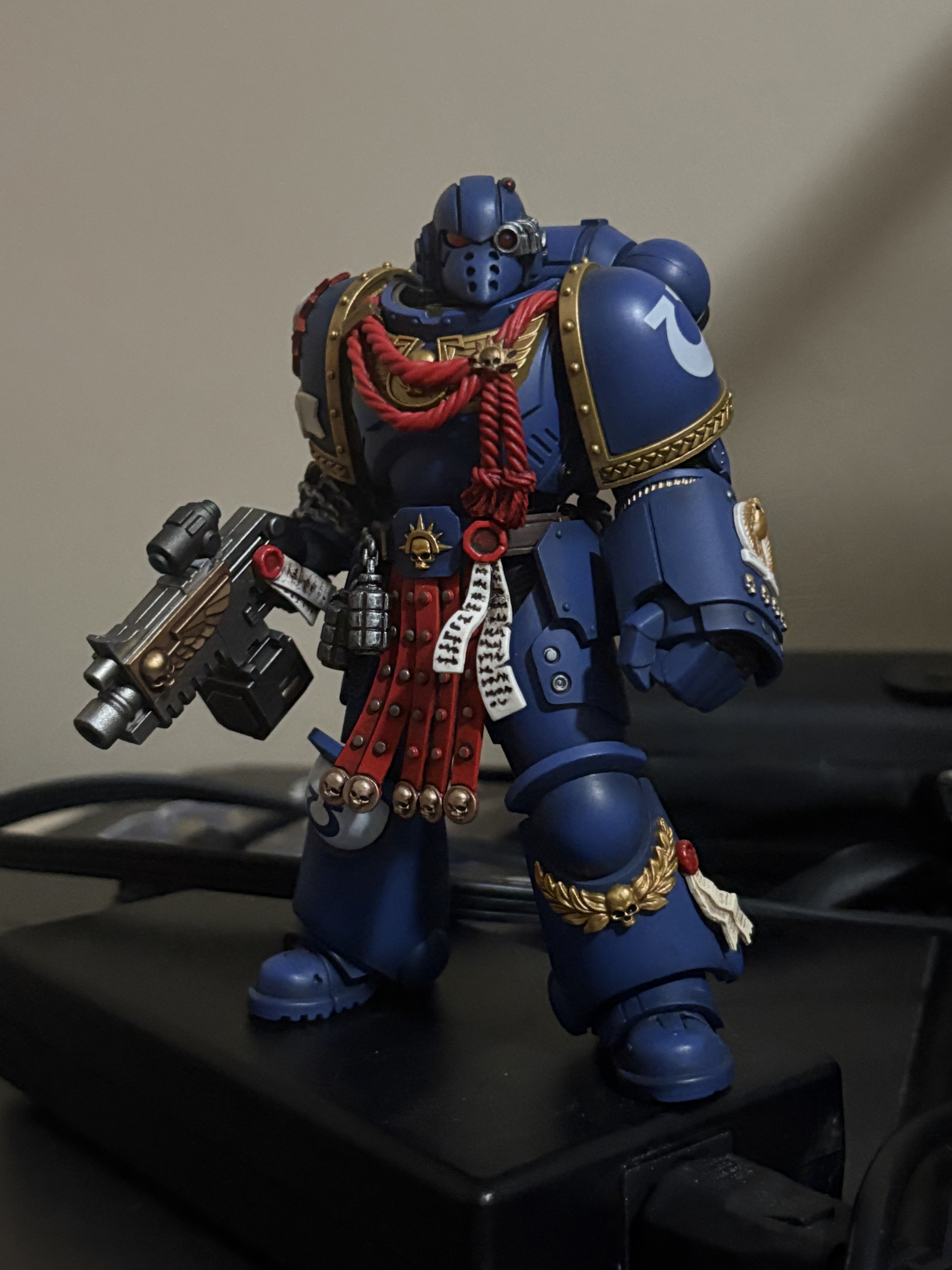 >>11627727The $60 HD special collectors edition Titus is very good value, as it has extra parts for the jetpack, helmet, and a full load out of a rifle, pistol, and chain sword, as well as the extra paint work. I don't have that particular figure, but from what I can tell, it has just as good articulation as any other, which is to say really good.1.0 marines are the victims of size creep, so they're the smallest, but I think it manifests as like, an inch when compared to the videogame line? Arguably they have the worst articulation, because they have shoulder swivels that pop out for increased range, but besides that, pretty much all normal space marines have the same articulation range.You can tell 1.0s from the others by their knees and edge highlights, as their knee armor trim is flatter, whereas later sculpts have a shape that curves around the sides a lot more. Due to their edge highlights, 1.0s are still very good figures.2.0s are contentious, and the worst of the series, due to their VERY stiff hands that make holding and removing items risky. They also had shoulder popping issues. But if your a one time pose, then leave it on the shelf, guy, then they should be fine. You can tell something is a 2.0 if it comes with the two finger pointer hand, and sprawled open hand. I'd recommend any other version.3.0 and later are all very good figures, as they changed the hand plastic to something softer, and a better overall sculpt, but be mindful that newer marines, plus hours heresy marines, have experienced additional size creep and stand slightly taller.I'd recommend starting with a basic intercessor, commonly available for like $20 or less (even on Amazon!), as it's a low risk investment, and should be the latest versions (just check for those hands that I said to be weary of), and they come with a good load out as well (rifle, pistol, chain sword).After that I'd recommend a (or multiple) terminators.A termagant is like, $20-28? Love em.