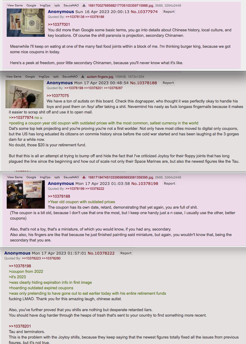 I don't usually come to these threads but there's some guy sperging out about JoyToy Warhammer figures in the Marvel general for no reason. What did you guys do to him?