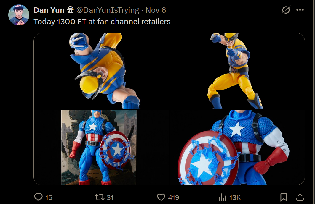Previous thread: >>11611682-Mezco Incredible Hulk solicited-Many Marvel Legends have been reissued or announced for reissue. This includes, Retro Kingpin, Warbird, black Silver Surfer, Power Princess, Astonishing Wolverine, and 20th Anniversary Captain America (Fan Channel Exclusives)-Marvel Legends Retro Spider-Man wave solicited (all major retailers)-Marvel Legends Deluxe Nimrod solicited (Fan Channel)-Mafex Wolverine (Masked Version) Solicited-SH Figuarts Gamerverse Spider-Man cancelled in select Asian regions-Marvel Legends Made to Order 12in X-Men 97 Apocalypse Solicited (Pre-Order open on Hasbro Pulse)-Marvel Legends Executioner BaF Wave solicited (Fan Channel)-Marvel Legends Black Bolt/Triton 2 pack solicited (Pulse/Fan Channel Exclusive)-Marvel Legends Medusa/Gorgon 2 pack announced (Pre-order 10/21 @ 1PM EST, Pulse/Fan Channel exclusive-Mafex Gambit (comic ver.) announced-Mafex Cyclops and Magneto reissued-Marvel Legends Mini Comic Wave 2 solicited (all major retailers)-Marvel Legends Gamerverse Punisher/Nick Fury 2 pack solicited (Fan Channel exclusive)-Marvel Legends Deathbird/Gladiator 2 pack Solicited (Fan Channel Exclusive)>Updated Marvel Legends Checklist: https://imgur.com/a/YAVUq40>Archived Threads:https://archive.palanq.win/toy/search/subject/Marvel%20General/>Searchable, Tagged Database For Marvel Legends Sorted By Year: https://figurelist.co/marvel-legends-checklist