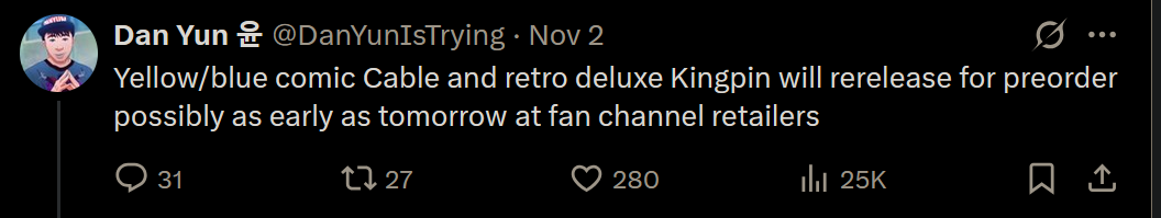 The rereleases are a bad sign, like they're trying to drain the last bit of money available for higher demand figures. They did rereleases before but not at this clip.
