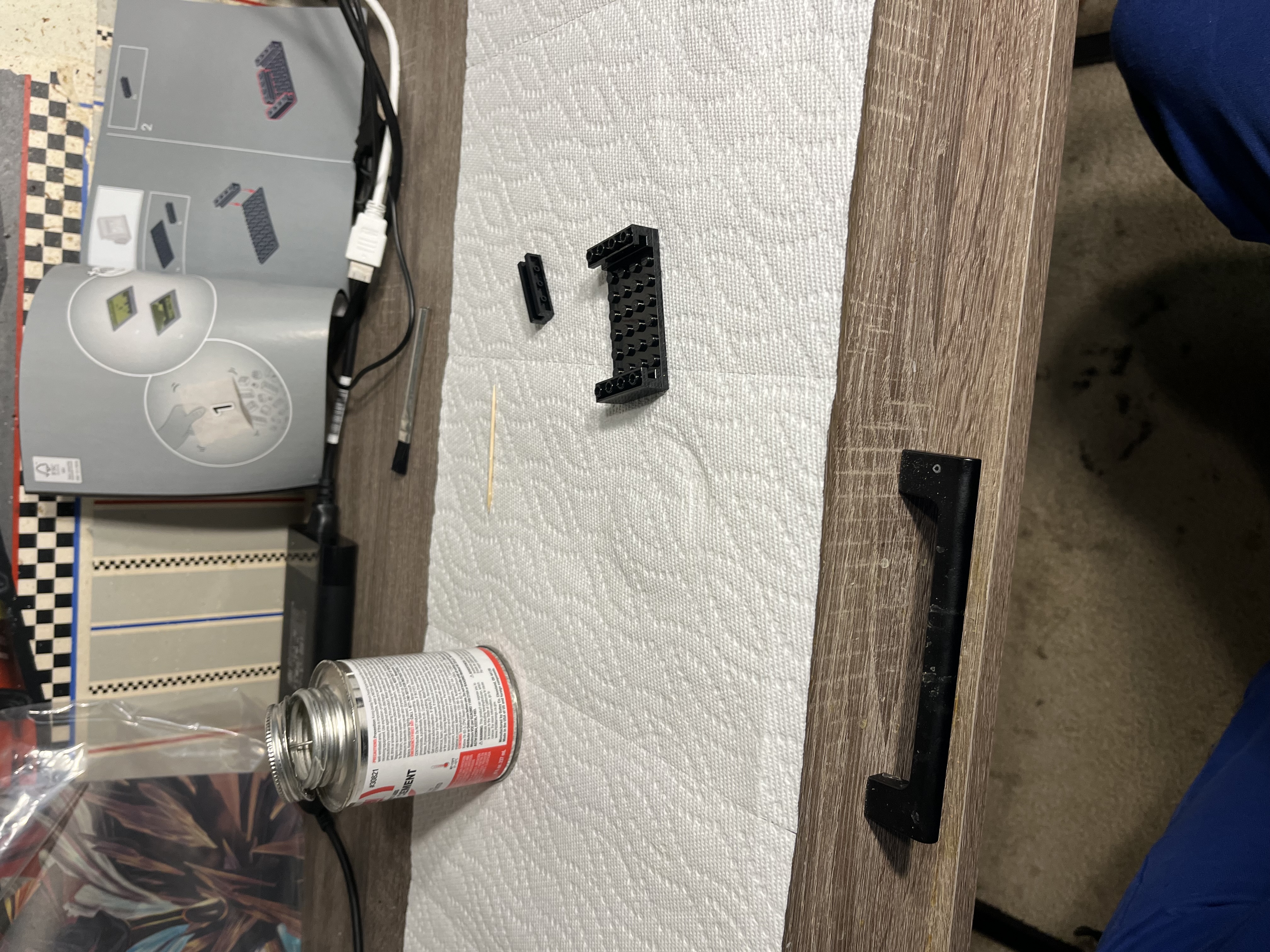>>11621872oak liquid cement abs. designed to permanently hold legos together. using a toothpick, brush, nitrile gloves, safety glasses and paper towels. do not use super glue. it sucks so much. disaster for me. this stuff works