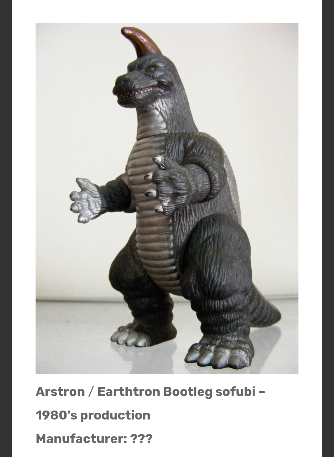 >>11641526Yeah, I said he was half Arstron, which is Earthron. He's got the twin ridges on his back and everything. The thing with this one is that I can't find the toy this bootleg is base on. Every other one has a clear ultra monster they're slapping horns on, including a red and gold Red King with horns, The Astronzilla doesn't have any like that, making him very unique among the bootlegs I got.