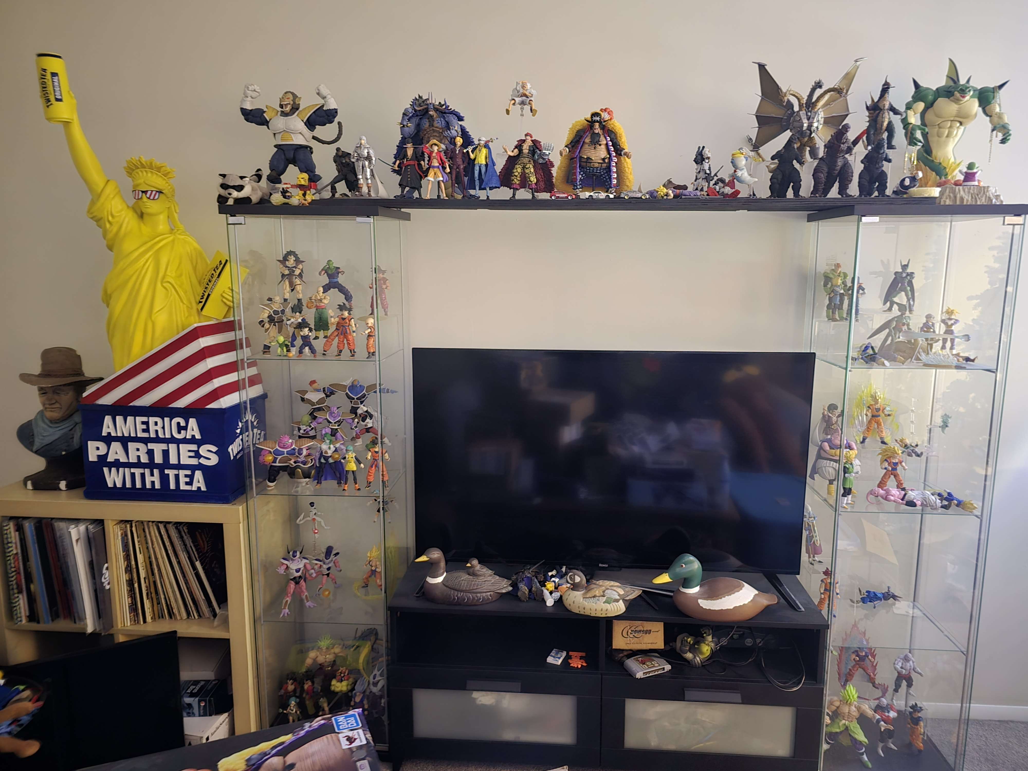 I need to get a riser for the tv to put some figures under it, and I've been trying to consolidate my DBZ figures to make room for One Piece and other stuff. Looks like shit, but I'm posting to shame myself into cleaning it up.