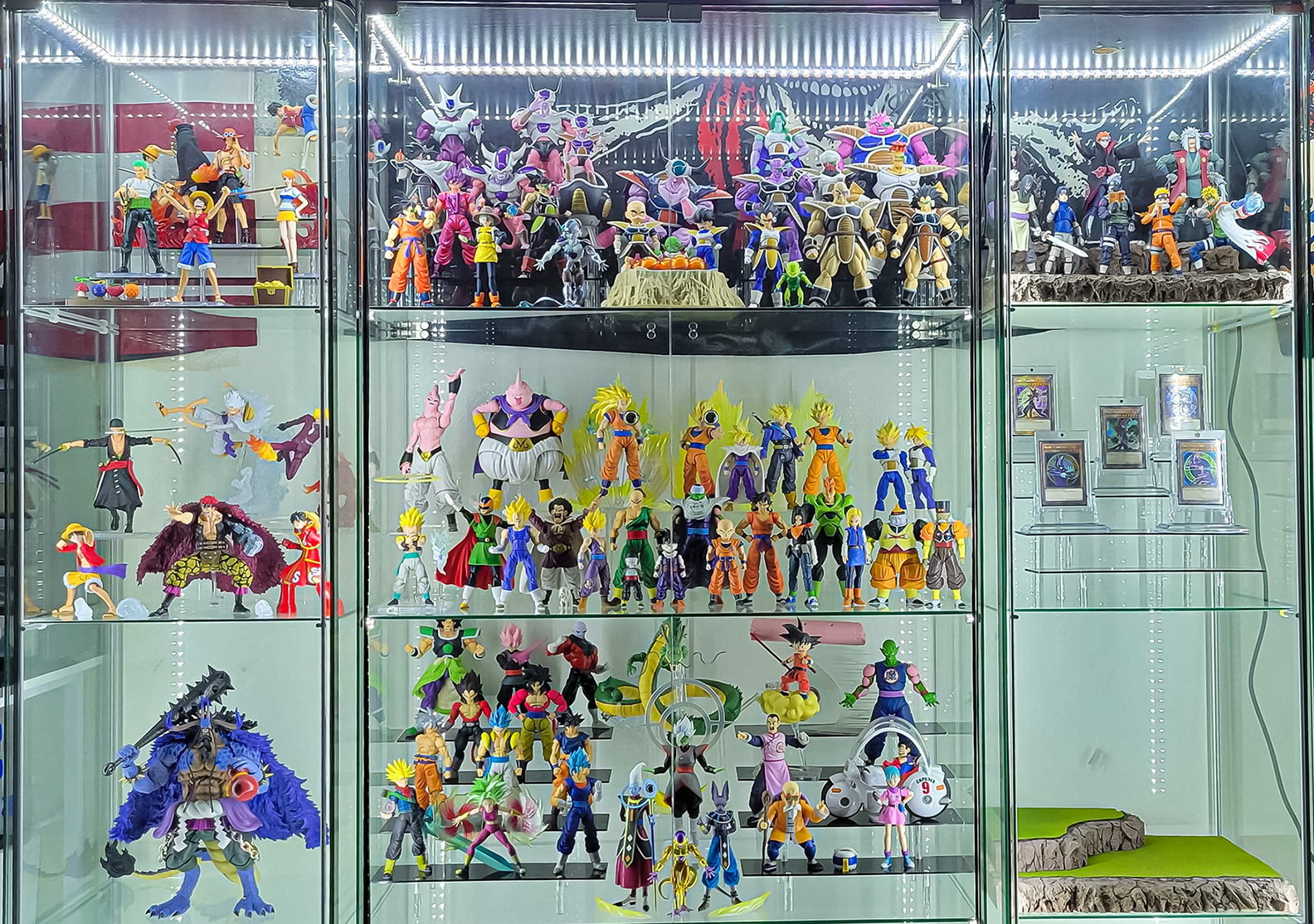 Just got my lights in earlier. Still a WIP but I'm happy with how it all ended up looking. I have Porunga and debating if I should take off his back fin and put him in somewhere. I'll probably add SHF Yami Yugi and Dark Magician to that card shelf too.
