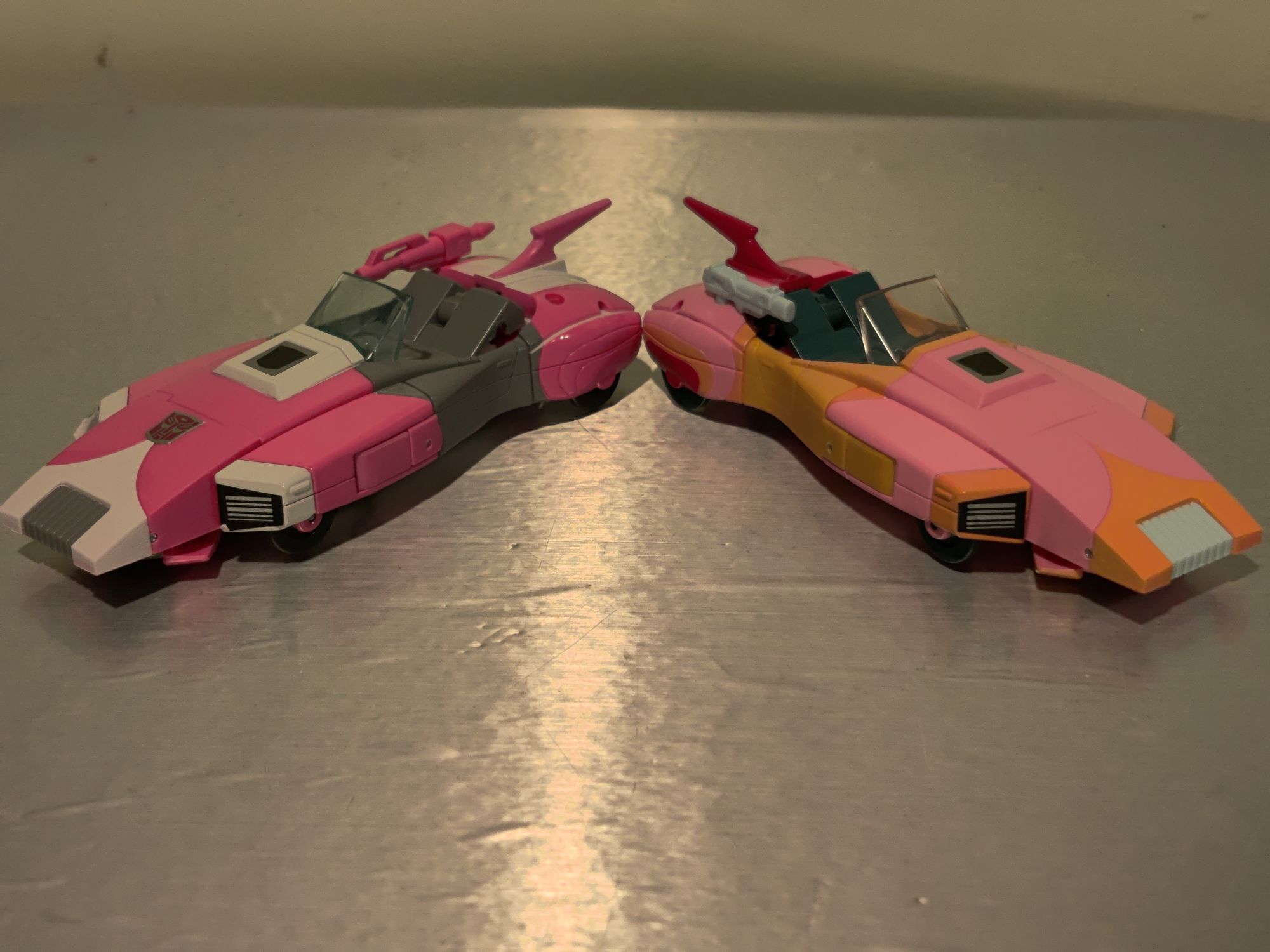 >>11660518Like the others, their transformation is fairly simple, but effective - and, more importantly, fun. They also feel pretty solid - no real hollowness to them, and the plastic quality is good, they have a decent amount of heft that's not present on most modern Transformers. Articulation is good (no wrists or waist swivel, but that was to be expected), and they surprisingly have weapon storage in both modes (their guns can tab into a little peg hole next to their spoiler fin). What's really incredible is how little of a backpack they have - something modern Arcee designs tend to struggle with.Of the two, I think my favorite one is the Prototype Colors version - she's brighter and feels more unique to me, though I like Cartoon Colors version's gun better. I'm going to use them as two different characters, though I haven't decided what I want to call Proto Arcee yet.